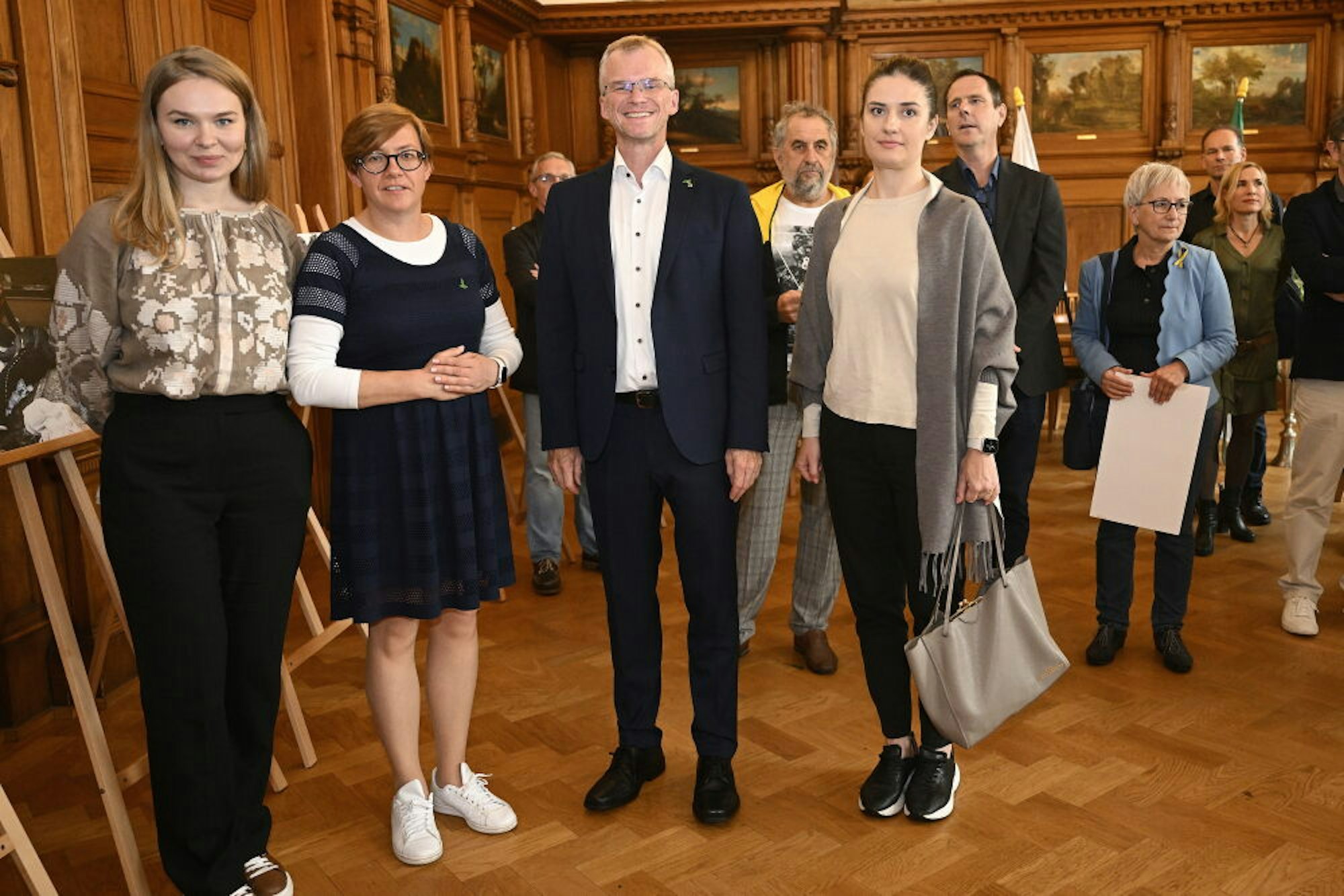 Bei der Ausstellungseröffnung im Rathaus: Bürgermeister Frank Stein mit (v.l.) Mykhailyna Skoryk-Shkarivska und Alina Saraniuk aus Butscha