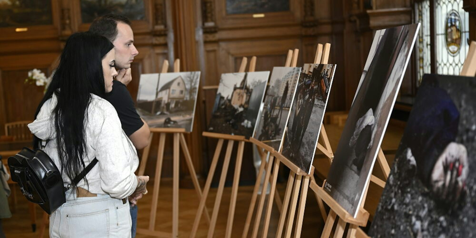 Berührend: Die Ausstellung von Bildern aus Butscha, die noch bis Mittwoch im Rathaus Stadtmitte zu sehen ist.