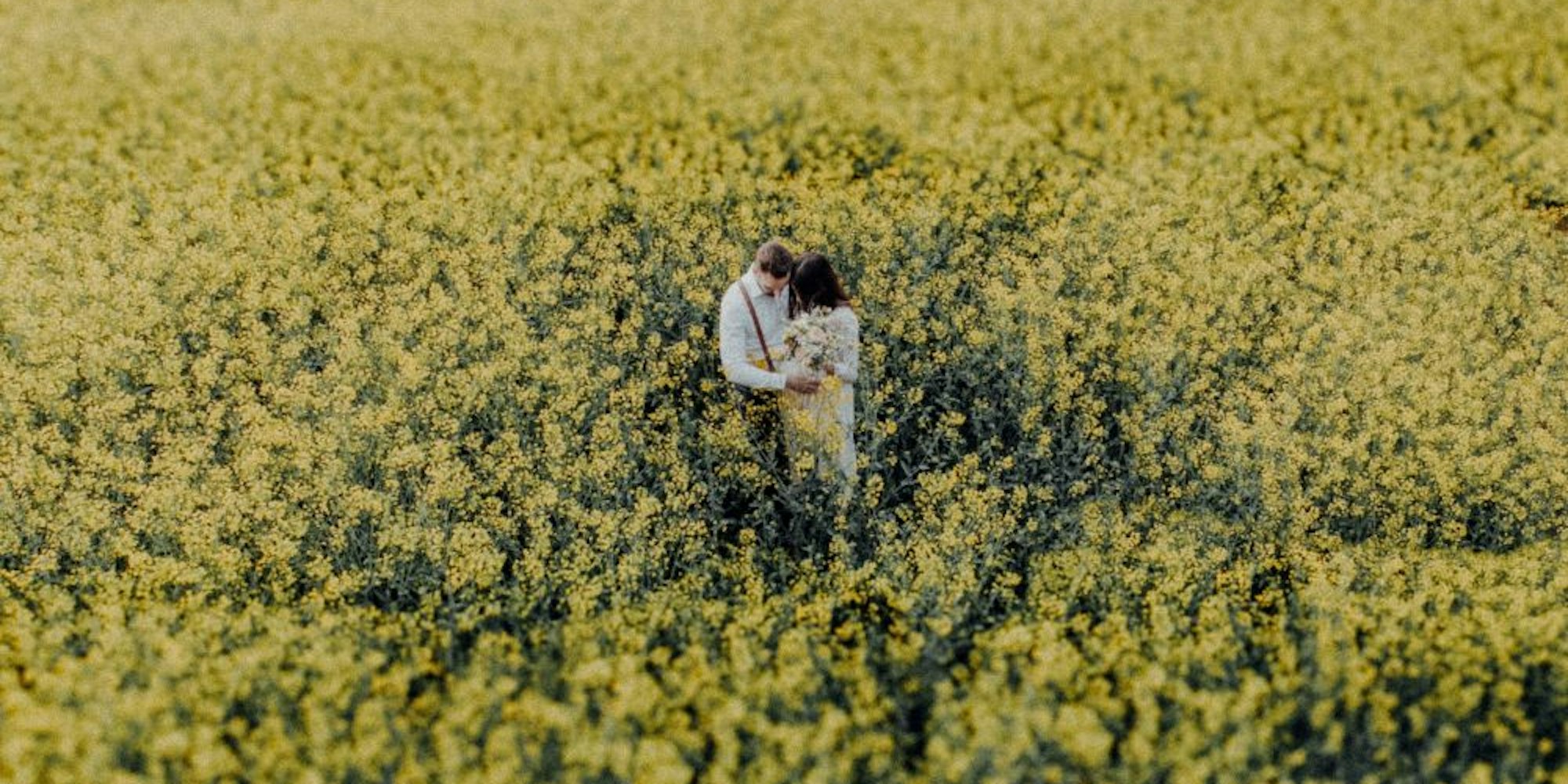 Paar im Rapsfeld: Damit wurde Lars Gode „Hochzeitsfotograf NRW“. Das Fotografieren mit der Drohne gehört dazu, ist aber nur eine Ergänzung zum Fotografieren aus der Hand, niemals ein Ersatz.