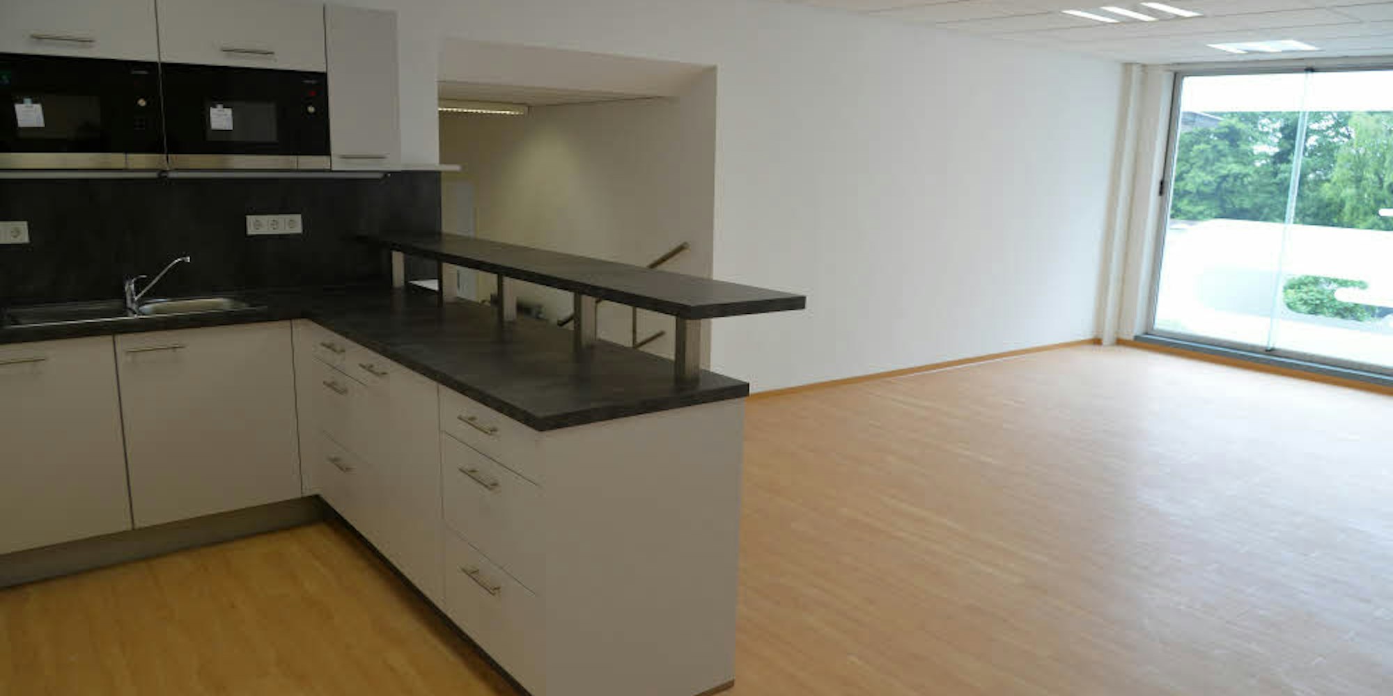 So gibt es beispielsweise am Ende des Flurs auf der zweiten Etage eine moderne Küchenzeile mit Theke und einem hellen, großzügigen, noch völlig leeren Aufenthaltsbereich. „Wie der gestaltet wird, ob mit Stehtischen oder Sitzecken oder noch anders, sollen die Mitarbeiter selbst entscheiden“, sagt Wilhelm. Dort könnte man gemeinsam zu Mittag essen oder sich zum Kaffee treffen. Der neue Standort in Heidkamp, weit weg vom Zentrum, habe bei den Mitarbeitern auch Fragen aufgeworfen, so Wilhelm.