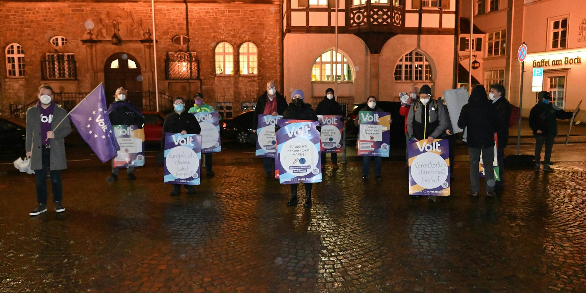 Bergisch Gladbach – „Corona gemeinsam überwinden“, „Verantwortung übernehmen: Impfen!“ und „Wissenschaft ist keine Glaubensfrage“ steht auf den Plakaten, mit denen sich Mitglieder der Europapartei Volt am Montagabend demonstrativ vor das Gladbacher Rathaus stellten, das wieder Ziel einer erneut gewachsenen Zahl von „Montagsspaziergängern“ war. Die Volt-Aktion war die erste offiziell angemeldete Gegendemonstration gegen die seit Wochen zunehmenden, unangemeldeten „Corona-Spaziergängen“, mit denen die Teilnehmenden – gleichwohl ohne Transparente und Plakate – mutmaßlich gegen die Corona-Schutzmaßnahmen protestieren.