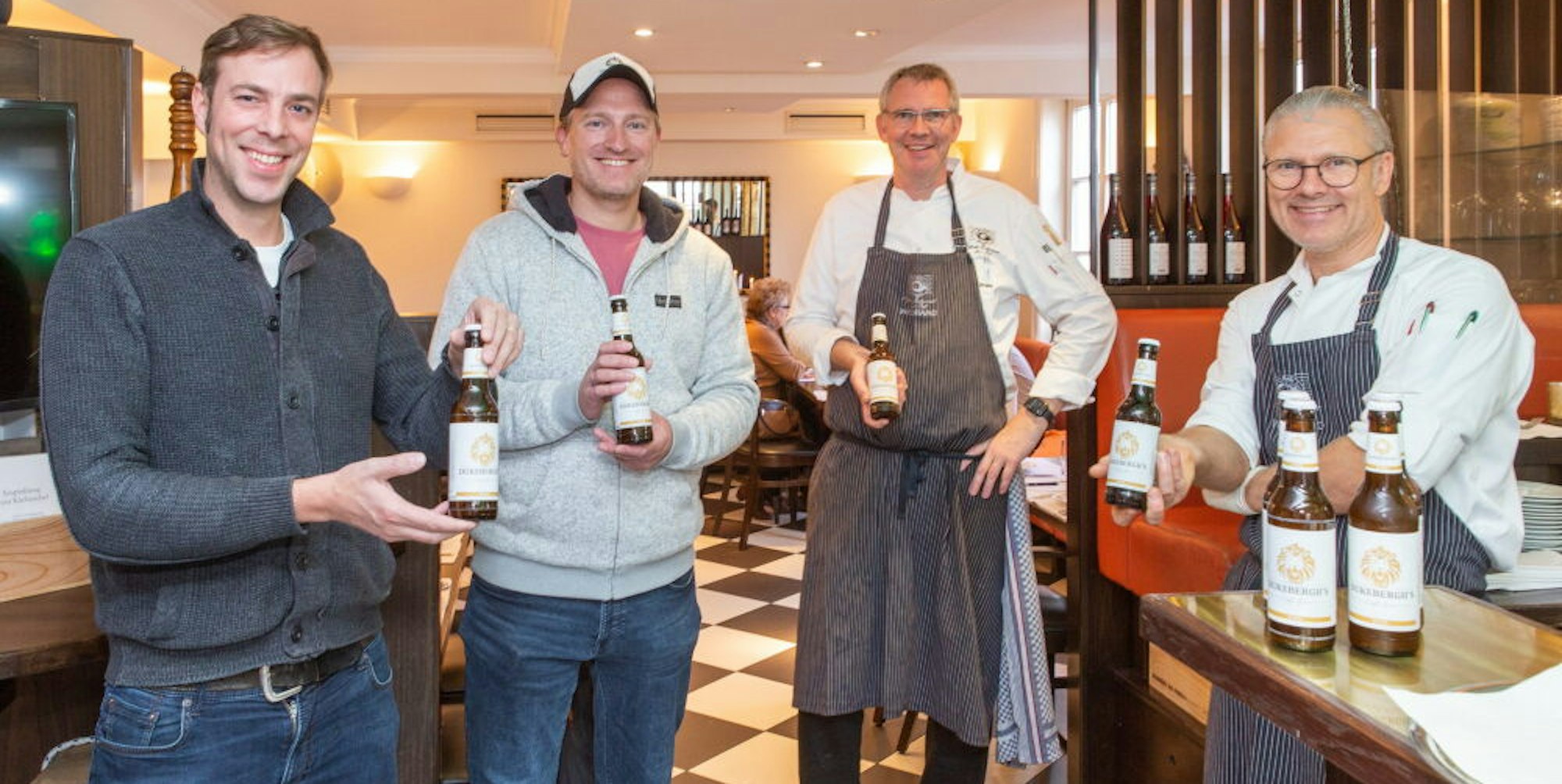 Dukebergh’s, das Craft-Bier aus dem Bergischen Land, haben Björn Thoms und Sebastian Kaiser gebraut. Alejandro Wilbrand und Christopher Wilbrand vom Hotel Restaurant zur Post in Odenthal freuen sich über eine Lieferung (v. l.).