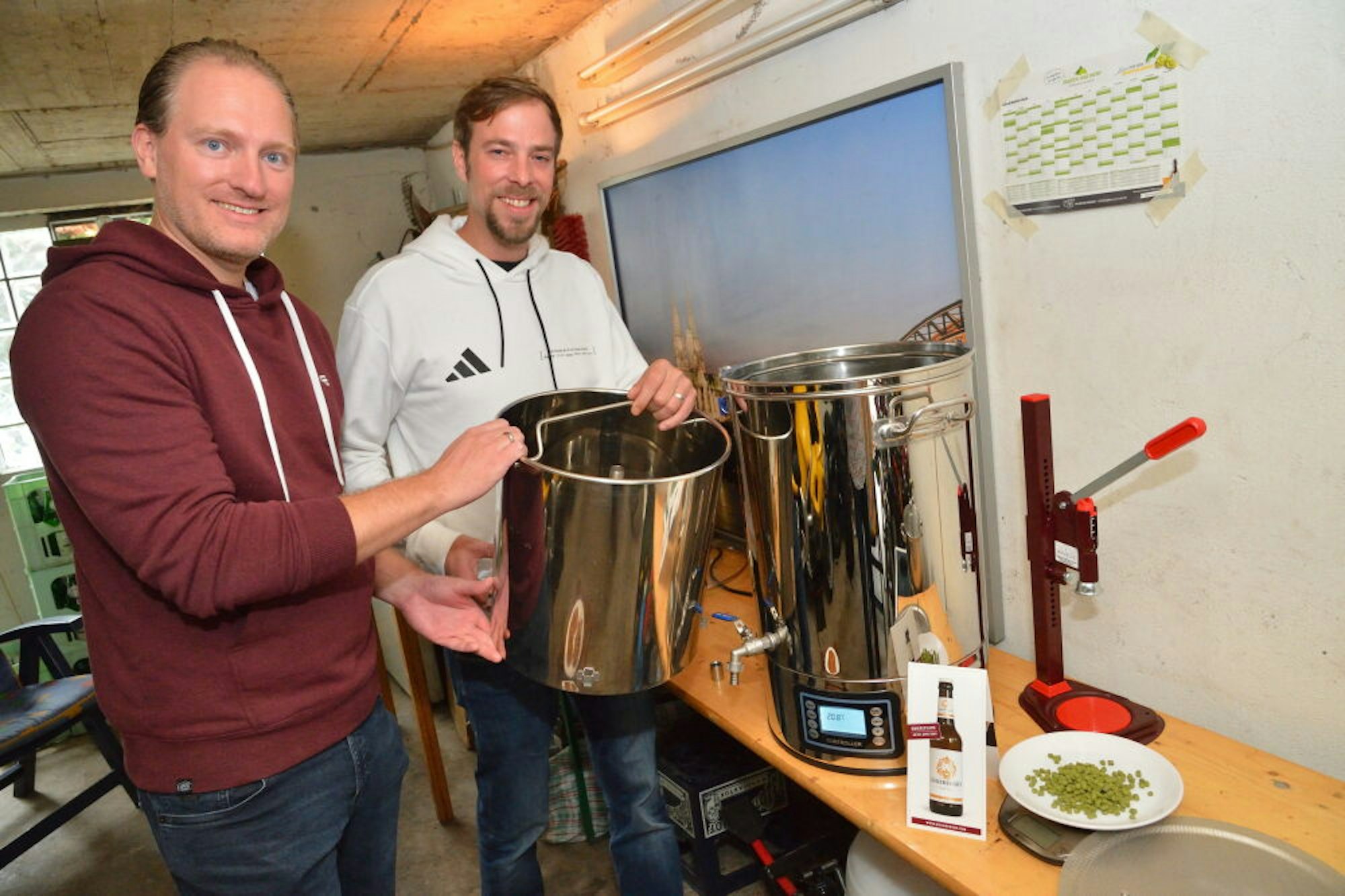 Die Hobbybrauer Björn Thoms (r.) und Sebastian Kaiser kreieren Craft-Biere in der Schildgener Garage von Thoms.