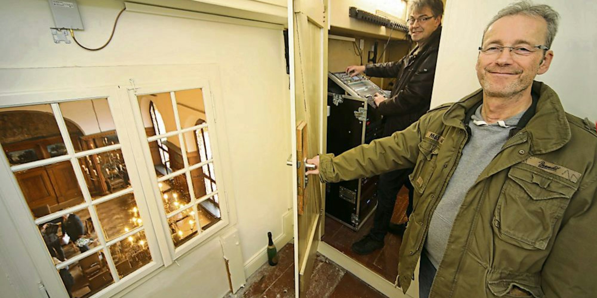 Durch das Fenster kann man hinunter in den Gladbacher Ratssaal sehen, der Technikraum in luftiger Höhe ist das Reich von Wolfgang Löffelsend (rechts) und Günter Schomann.