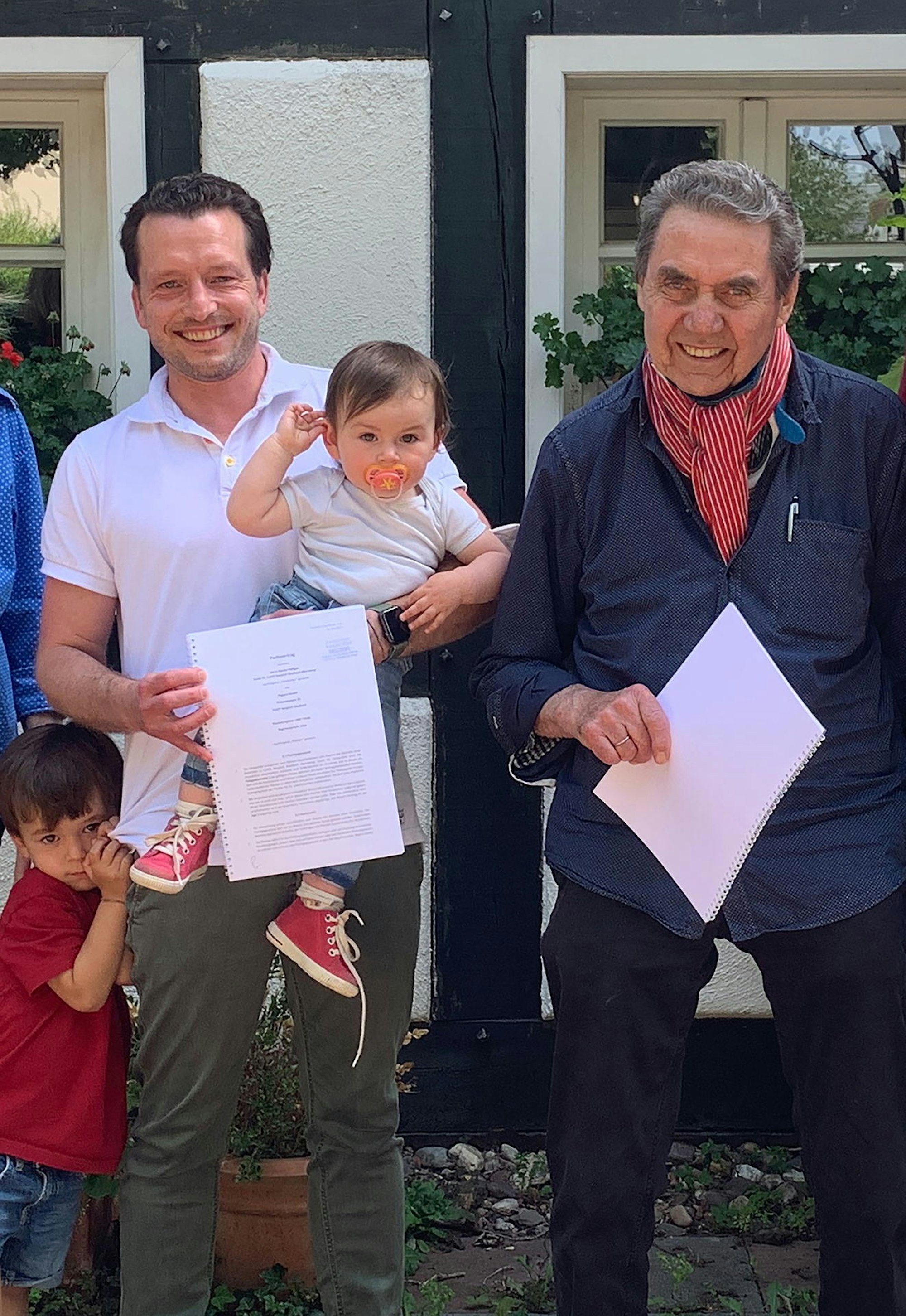 Günter Päffgen (r.) mit Sebastian Fitzon und dessen Kindern nach der Unterzeichnung des Pachtvertrags im Sommer 2021.