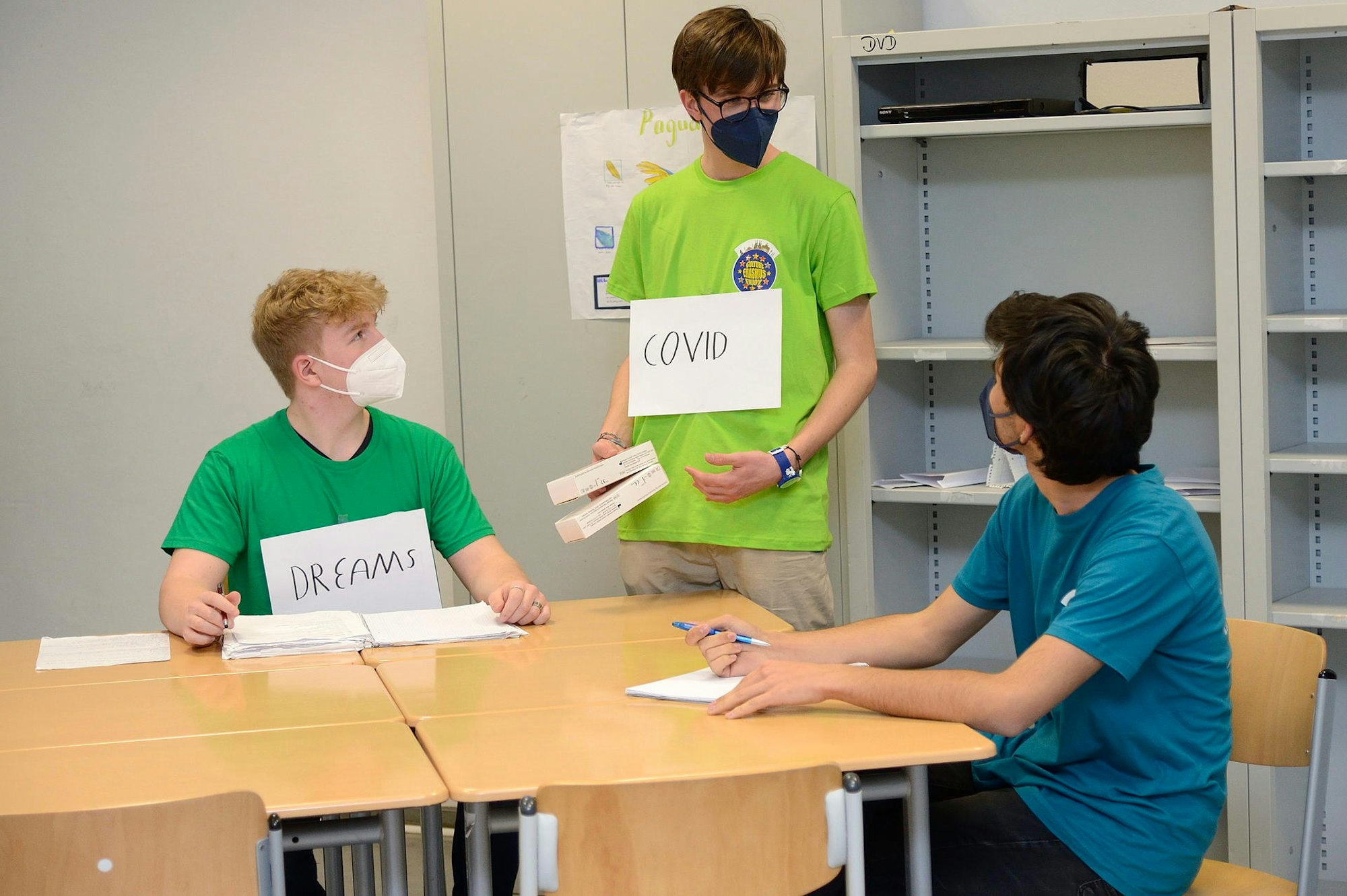 Die Szene ist Teil der Theaterproduktion „Leca – Youth and Covid“, die Jugendliche aus fünf Ländern am Albertus-Magnus-Gymnasium (AMG) zeigen. Neben rund 20 Schülerinnen und Schülern des AMG sind auch je fünf Gleichaltrige aus Dänemark, Norwegen, Spanien und der Türkei beteiligt, die im Rahmen eines Erasmus-Austauschprojekts an der Schule zu Gast sind. Der Aufenthalt der Gäste ist aber zeitlich begrenzt, in nur einer Woche mussten die Beteiligten ihre Spiel- und Tanzszenen zum Thema „Youth and Covid“ (Jugend und Covid) erarbeiten.