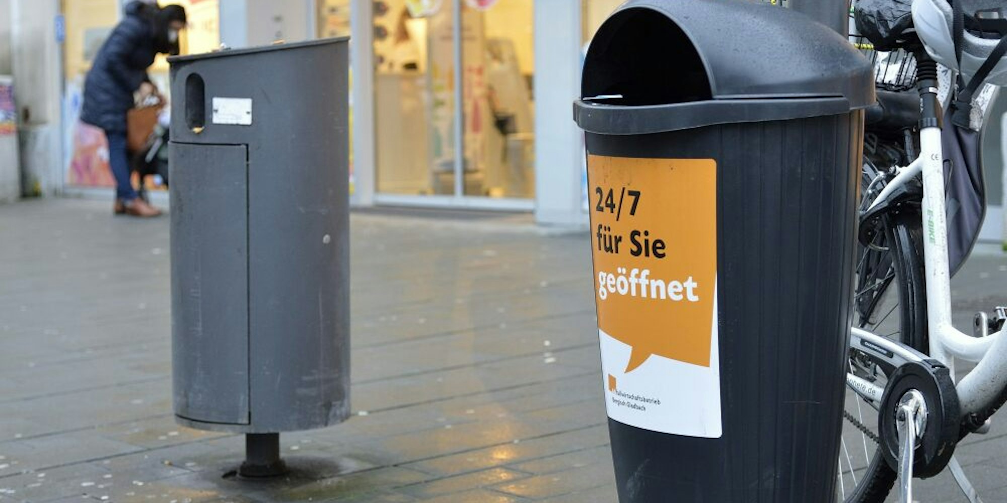 In direkter Konkurrenz in der Gladbacher Innenstadt: Links der Mülleimer, der im Wettbewerb als passend und hochwertig für die Fußgängerzone befunden wurde – rechts der Plastikmülleimer, der funktional den Unrat aufnehmen soll.