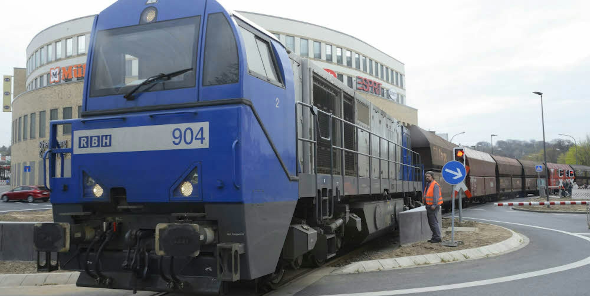 Der Zug fuhr quer durch den Kreisverkehr auf das Zanders-Gelände. Dafür wurden zahlreiche Schranken gebaut.