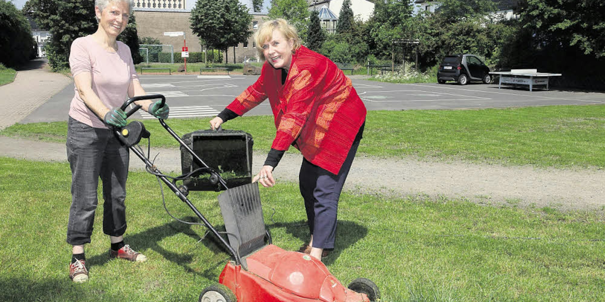 „Jetzt hat Schildgen endlich eine Mitte“, jubelt „die Ingrid“, wie ihre Freundin Resi Hembach sie begrüßt. Die Gärtnerin mäht freiwillig den Rasen, Ingrid rupft Unkraut, „aber schreiben Sie, dass wir dringend Unterstützung suchen“, ruft Resi Hembach noch, als wir uns auf den Weg „zum Weiden“ machen, am Bürgerzentrum vorbei.