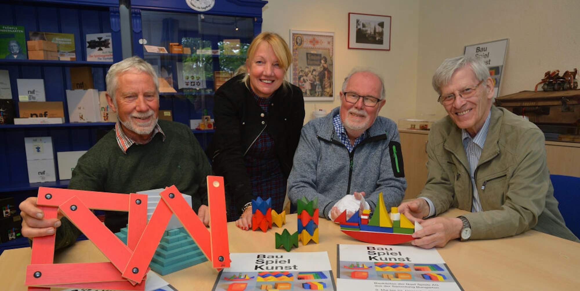 Spielzeugklassiker von Friedrich Fröbel aus der Gründungszeit des Kindergartens präsentieren Mitglieder des Vereins.