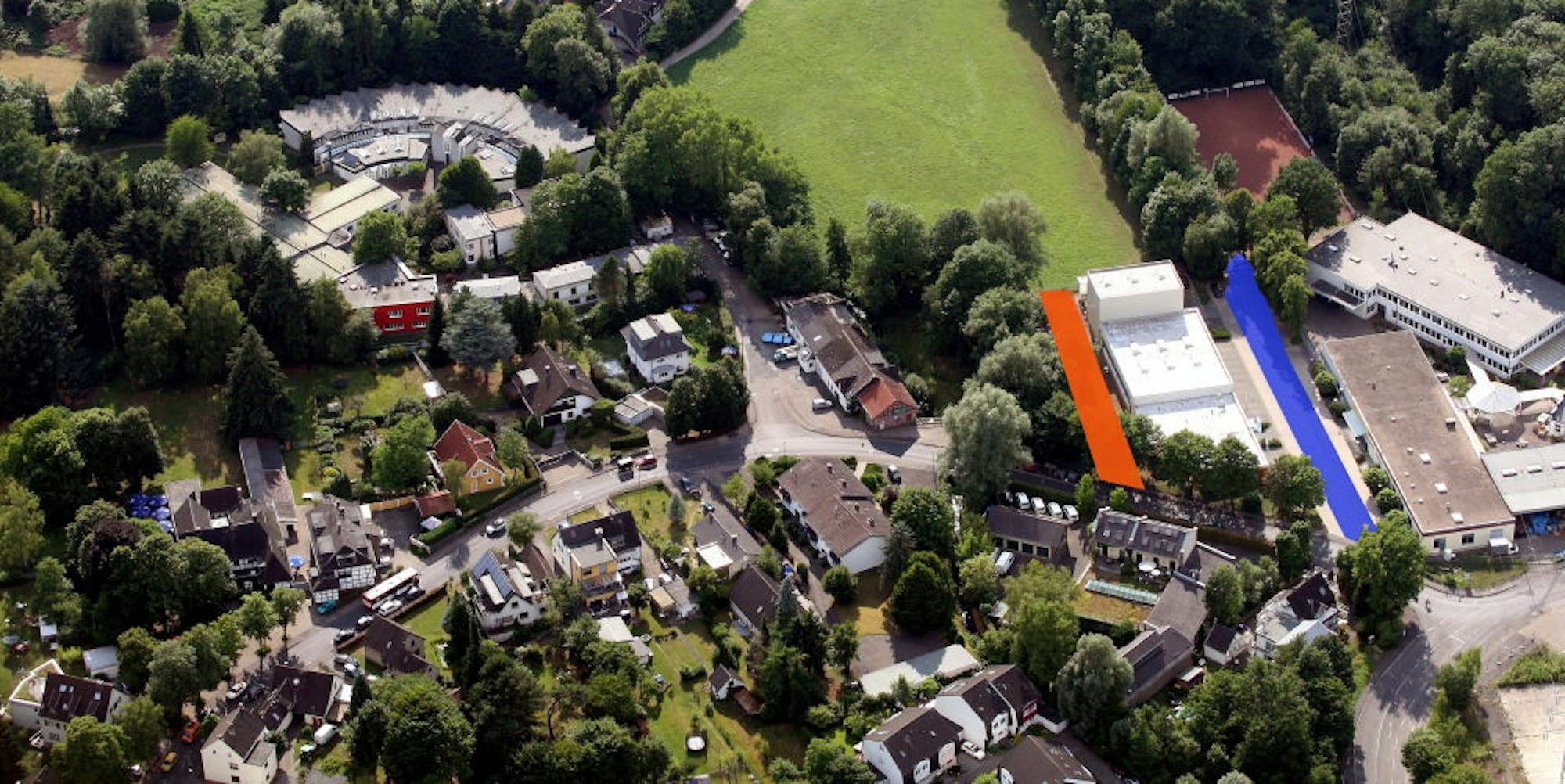 Das Gelände für die Klinikerweiterung. Auf dem Foto sind die bestehende Klinik, das Gelände für den Neubau und die bisherige Planung der Zufahrt (blau) sowie die neue Zufahrtsplanung (rot) zu sehen.