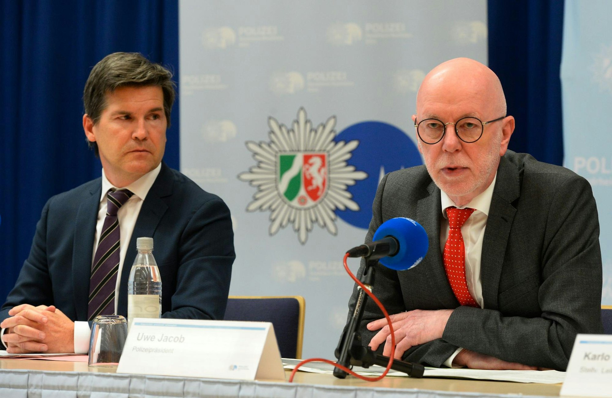 Oberstaatsanwalt Ulrich Bremer (links) und der Kölner Polizeipräsident Uwe Jacob nehmen Stellung zum aktuellen Stand der Ermittlungen wegen des Verdachts des schweren sexuellen Missbrauchs von Kindern.