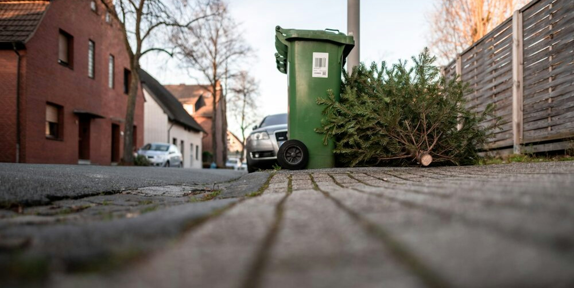 Ein Tannenbaum liegt an einer Straße neben einer grünen Abfalltonne. (Symbolbild)
