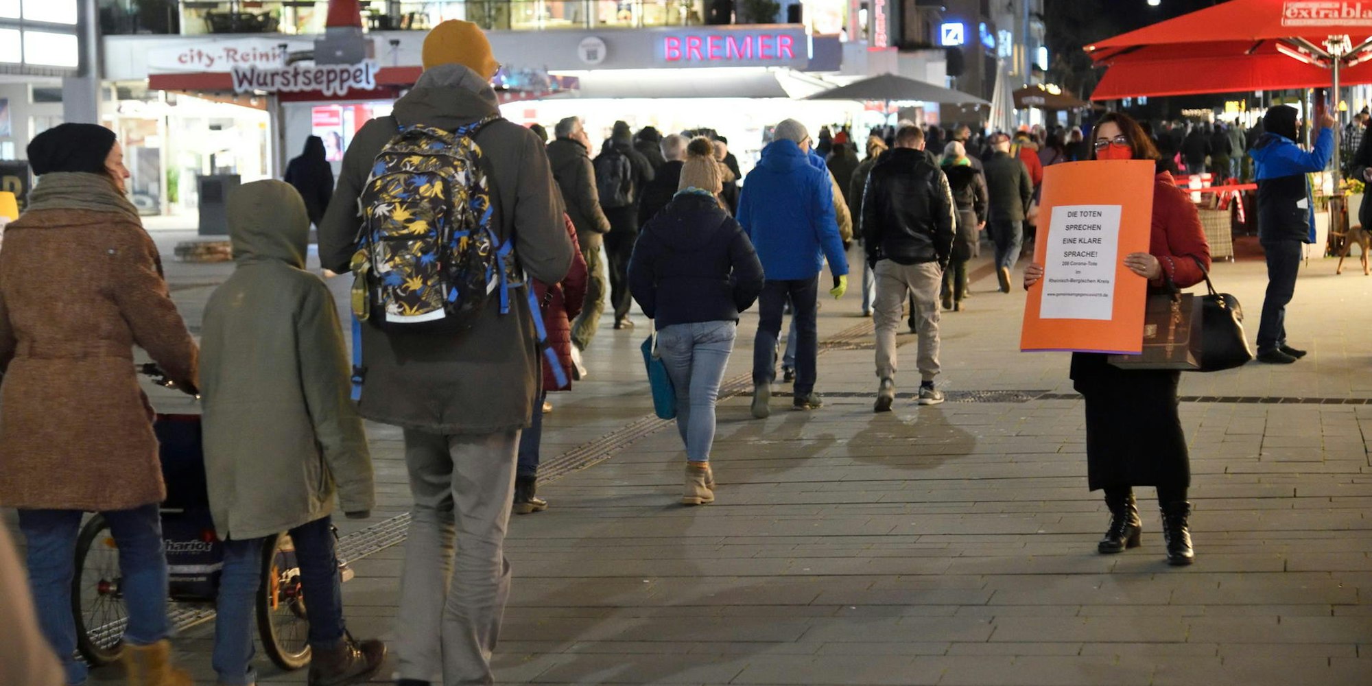 Bergisch Gladbach – Die Zahl der Teilnehmenden an den montäglichen „Corona-Spaziergängen“ hat in Rhein-Berg erneut zugenommen. Aber auch der Protest dagegen. Mehr als 1200 Männer, Frauen und Kinder beteiligten sich kreisweit an den „Spaziergängen“ mit Grablichtern, Kerzen und Lichterketten, allein knapp 900 zogen durch die Gladbacher Innenstadt.