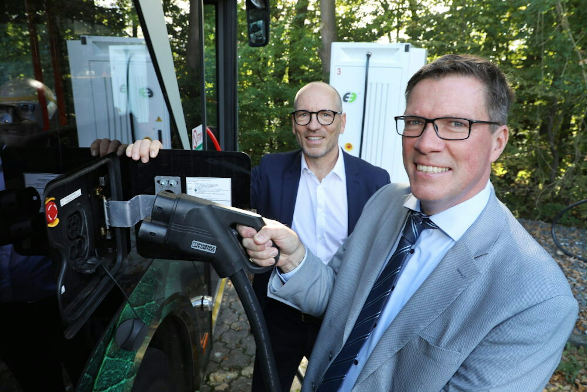 An der E-Bus-Ladesäule auf dem Betriebshof an der Hermann-Löns-Straße: Wupsi-Geschäftsführer Marc Kretkowski (l.) und Landrat Stephan Santelmann.