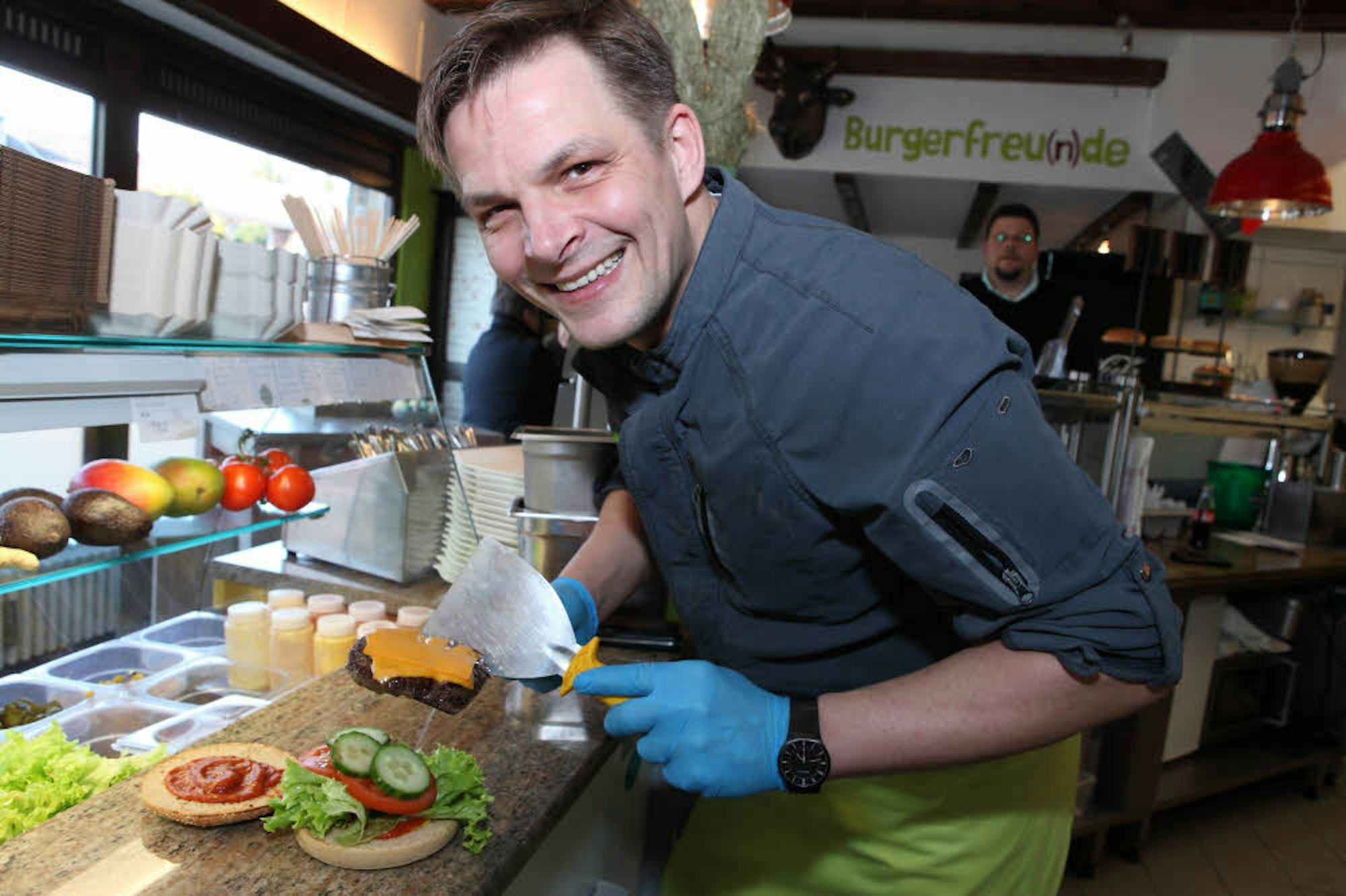 Die neue Zeit repräsentiert Alexander Kredelbach. „Burgerfreunde“ heißt der trendige Laden, in dem der junge Moitzfelder die angesagte Klops-Kultur pflegt. Hochwertiges Fleisch kommt aus der Eifel, auch für Schnitzel, Currywurst und Steak. „Alle Soßen sind selbst gemacht“, versichert Kredelbach. Bei getoasteten Brötchen kann man zwischen Broiche, Mehrkorn und Chili wählen. „Kommt sehr gut an“, freut sich der Burger-Bräter. Auch Peter Freyaldenhoven („bin eigentlich nicht so ein Fan“) ist angetan von der Kostprobe.