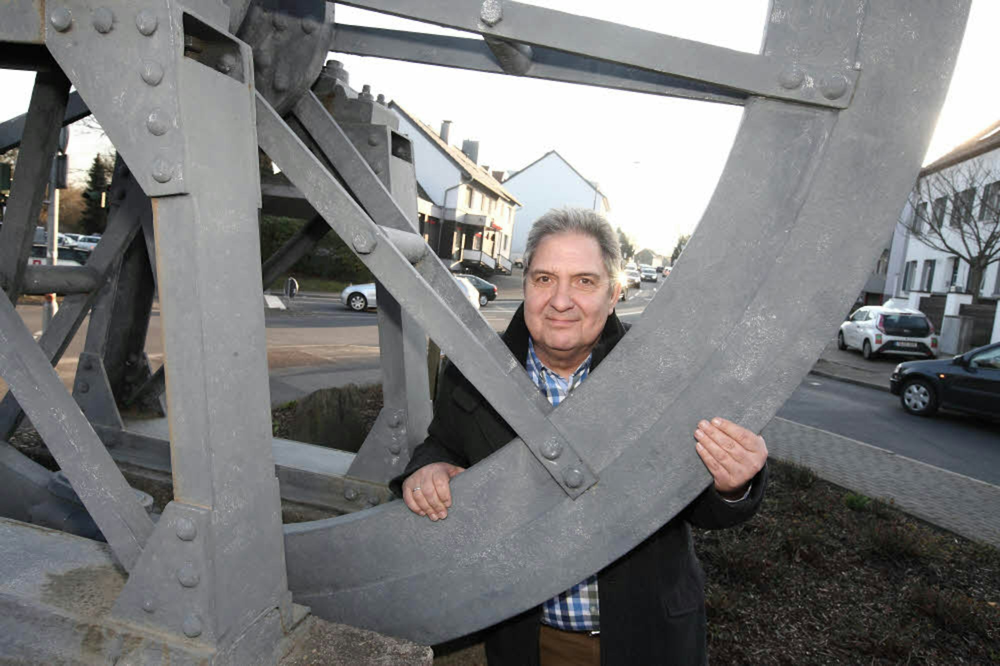 Peter Freyaldenhoven, Vorsitzender der Dorfgemeinschaft Moitzfeld, mit der historischen Seilscheibe am Ortseingang.