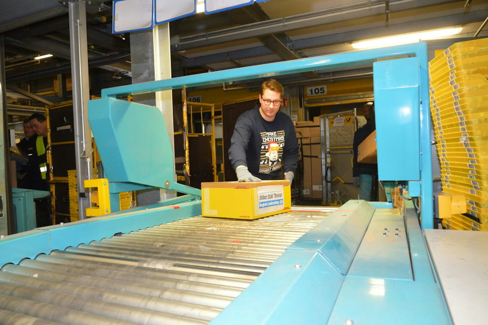 Jeder Zusteller habe die Straßen, in denen er ausliefere im Kopf und könne die Pakete entsprechend in die für die einzelnen Straßen vorgesehenen Behälter sortieren. An Weihnachten kommt eine ganz schöne Menge zusammen.