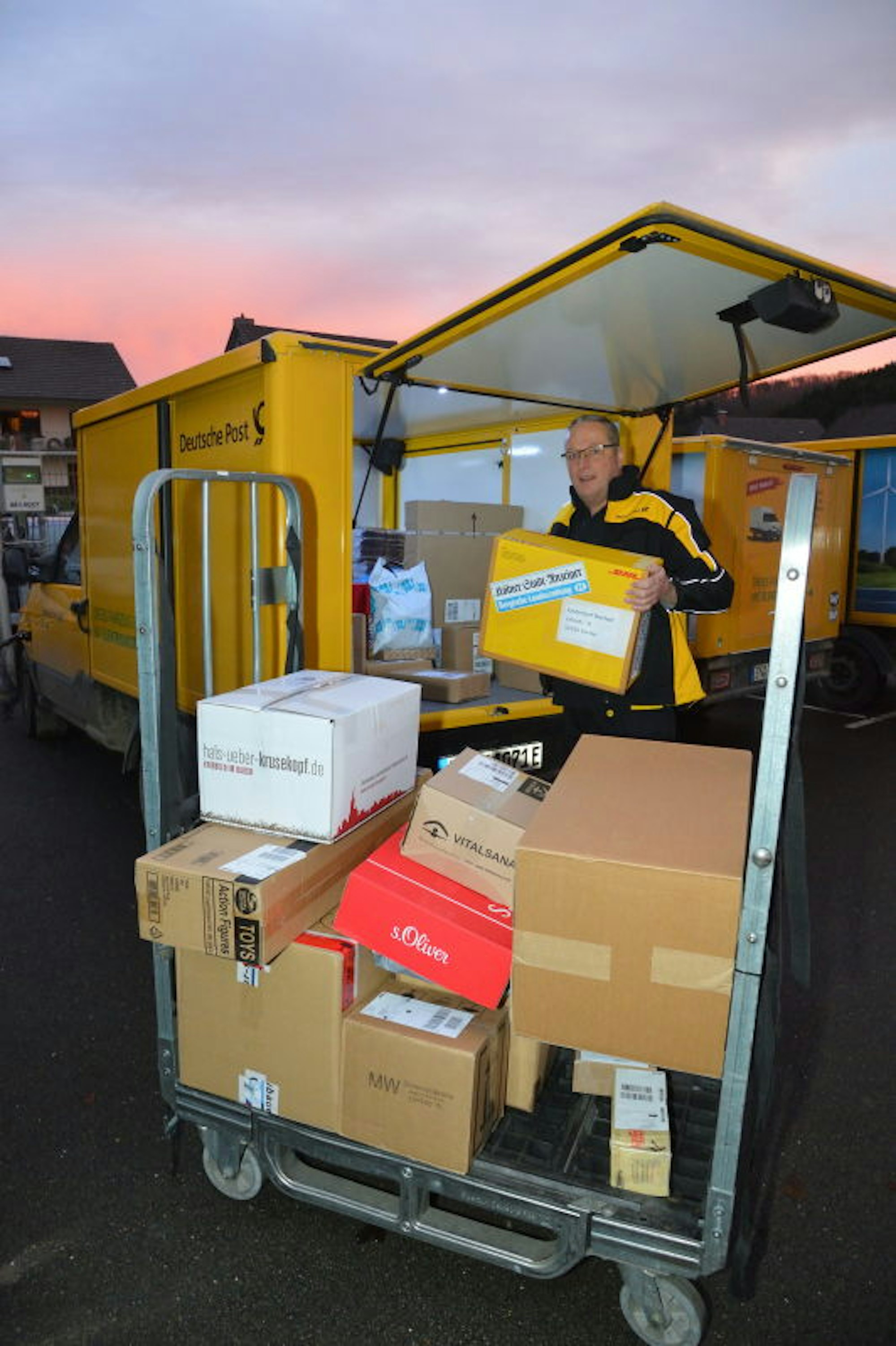 „Bei jedem Zusteller liegen zurzeit etwa 100 bis 150 Pakete im Auto“, erklärt Chris Borgwardt, Chef des Zustellungsstützpunktes Gummersbach, zu dem die Standorte Bergneustadt, Kürten, Lindlar, Overath und Wipperfürth gehören. Die Pakete sind allerdings nicht die einzige Fracht an Bord der Postautos. Dazu kommen auch alle Briefe, denn in Kürten sind Verbundzusteller unterwegs, die beides ausliefern müssen, erklärt Dieter Pietruck, Pressesprecher der Deutschen Post.