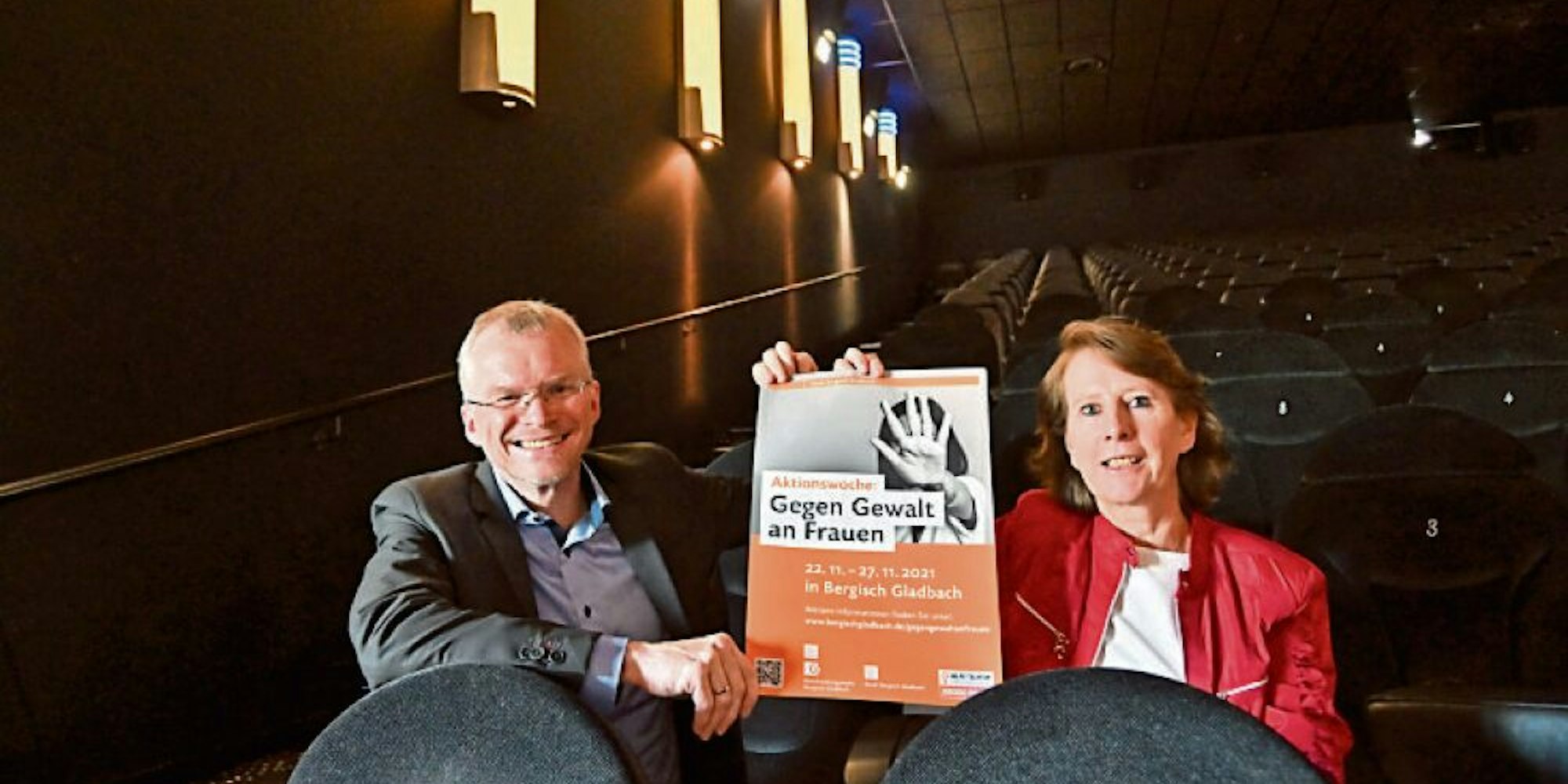 Gleichstellungsbeauftragte Judith Klaßen und Bürgermeister Frank Stein präsentierten im Cineplex-Kino das Programm.