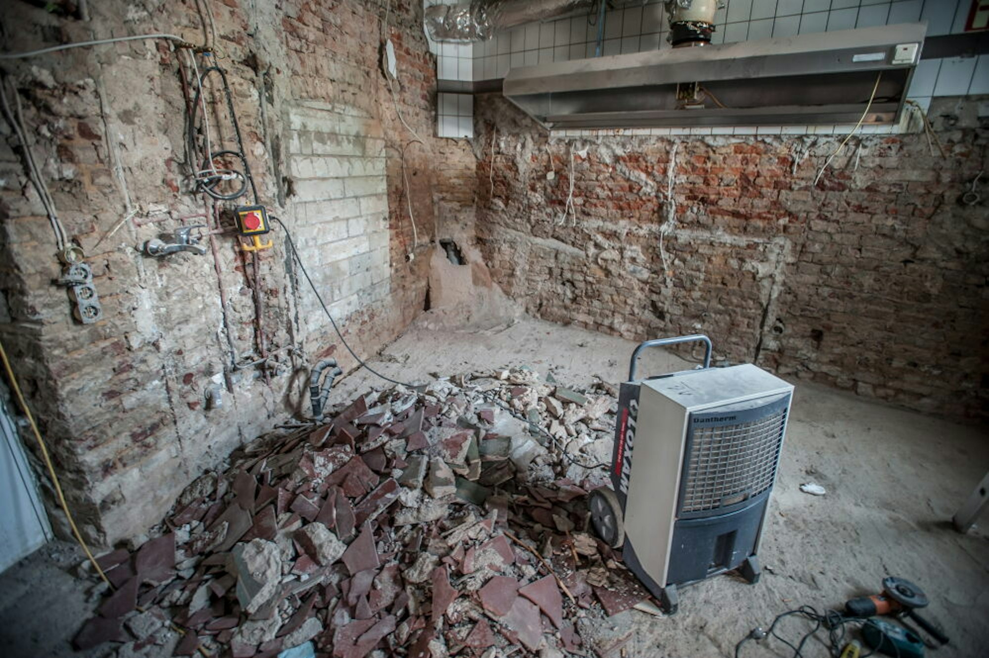 1,20 Meter hatte das Hochwasser Mitte Juli im Erdgeschoss des Restaurants gestanden, erzählt er. Der Keller war bis unter die Decke überschwemmt mit Schlamm. An den Fenstern konnte man die Wasserlinie ablesen, schildert Hahn. Nun lassen sie alles rausreißen, Putz, Estrich, die feucht gewordene Dämmung. Sieben Trocknungsgeräte laufen derzeit auf der Baustelle. Joachim Hahn kommentiert wie so viele mit Galgenhumor: „Wir haben so festgestellt, dass wir am tiefsten Punkt in Leichlingen liegen.“