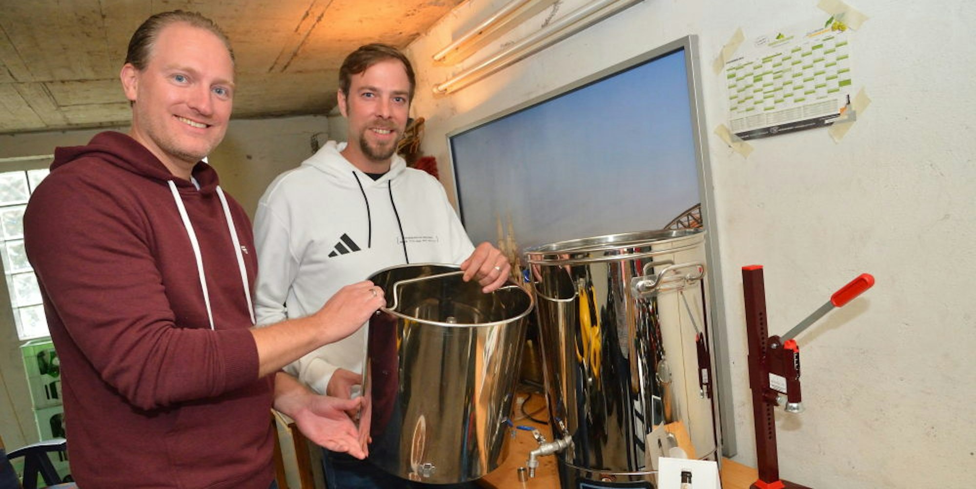 Sebastian Kaiser (l.) und Björn Thoms haben zwei Jahre verschiedene Bier-Rezepturen in ihrer Garage in Bergisch Gladbach-Schildgen ausprobiert.
