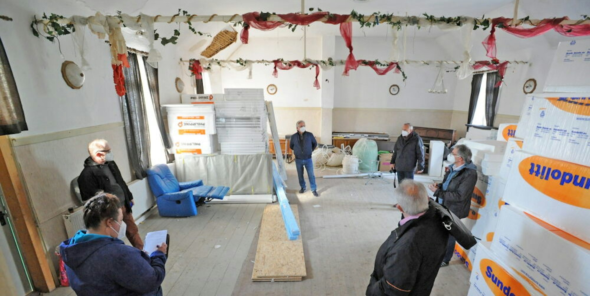 Im Fest- und Turnsaal hängen noch Girlanden an der Decke. Derzeit lagert hier Material für die Baustelle nebenan.