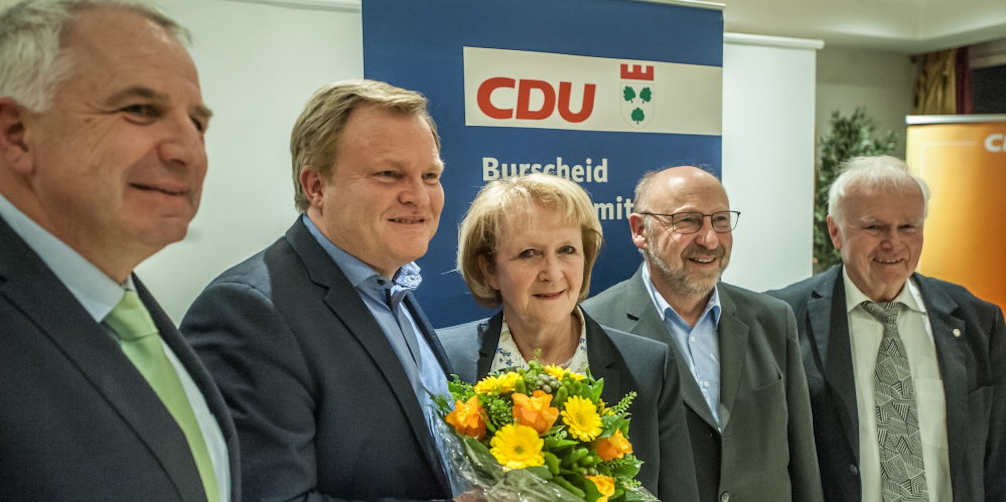 Stefan Caplan (mit Blumenstrauß) soll als CDU-Bewerber eine dritte Amtszeit als Burscheider Bürgermeister bekommen.