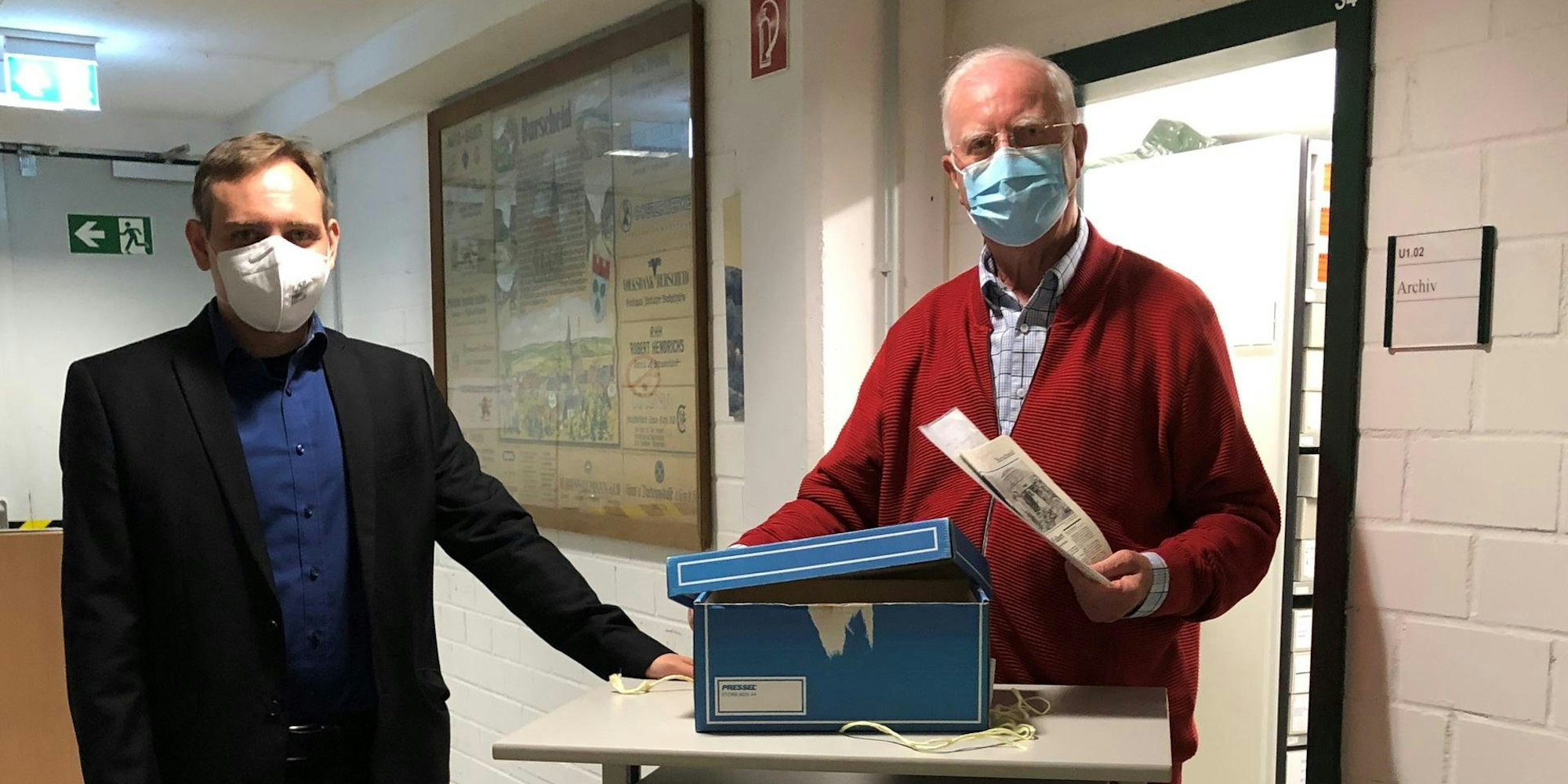 Stadtarchivar Sascha Kempf (links) mit Rolf Stöcker bei der Übergabe der Geschichts-Dokumente.