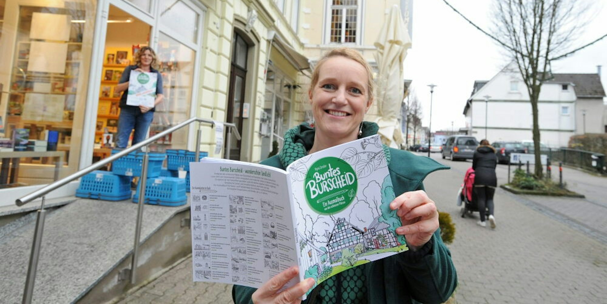 Myria Stricker vor der Buchhandlung Hentschel, die auch in ihrem neuen Ausmalbuch „Buntes Burscheid“ vertreten ist.