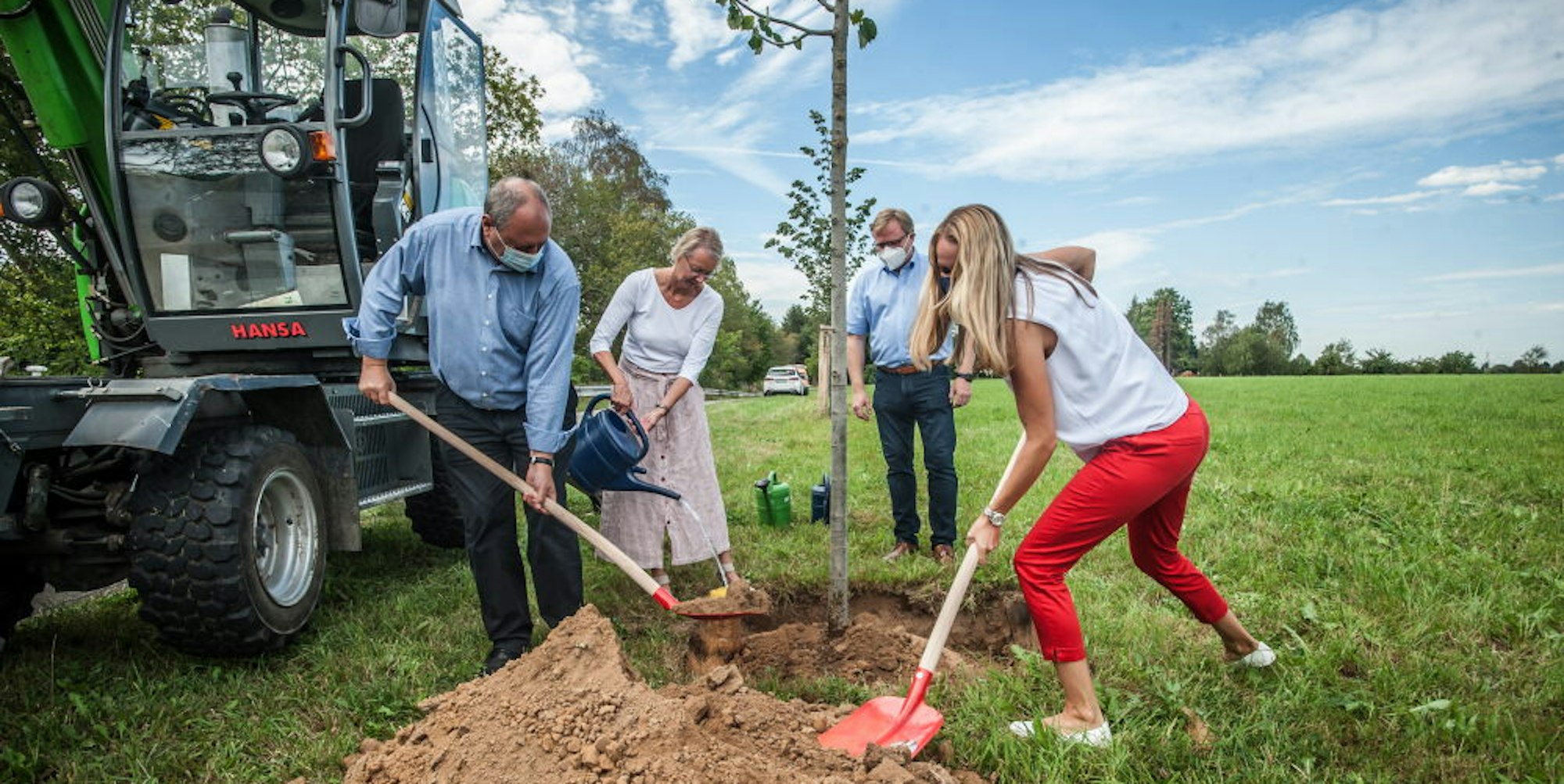 Maryo und Sabine Fietz (l) haben 12 Silberlinden gespendet und pflanzen sie mit Stefan Caplan und Svenja Mühlsiegl