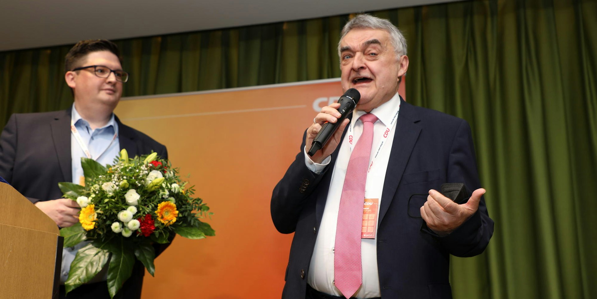 „Wir haben einiges geschafft, aber da ist noch verdammt viel zu tun“, zählt Reul die Erfolge der vergangenen Jahre auf: von der niedrigsten Kriminalitätsrate in NRW bis zur Aufstockung und konzertierten Modernisierung der Polizei und ihrer Ausstattung unter anderem im Kampf gegen Kindesmissbrauch. „Der Neuanfang in der Innenpolitik ist auf einem gutem Weg, aber noch nicht beendet“, so Reul. Deshalb wolle er sich mit vollem Einsatz um ein Landtagsmandat bewerben, nicht halbherzig, nicht über die Reserveliste, sondern als Direktkandidat mit vollem Einsatz im Wahlkampf, „mit dem Beleg, dass ich es wirklich ernst meine“.