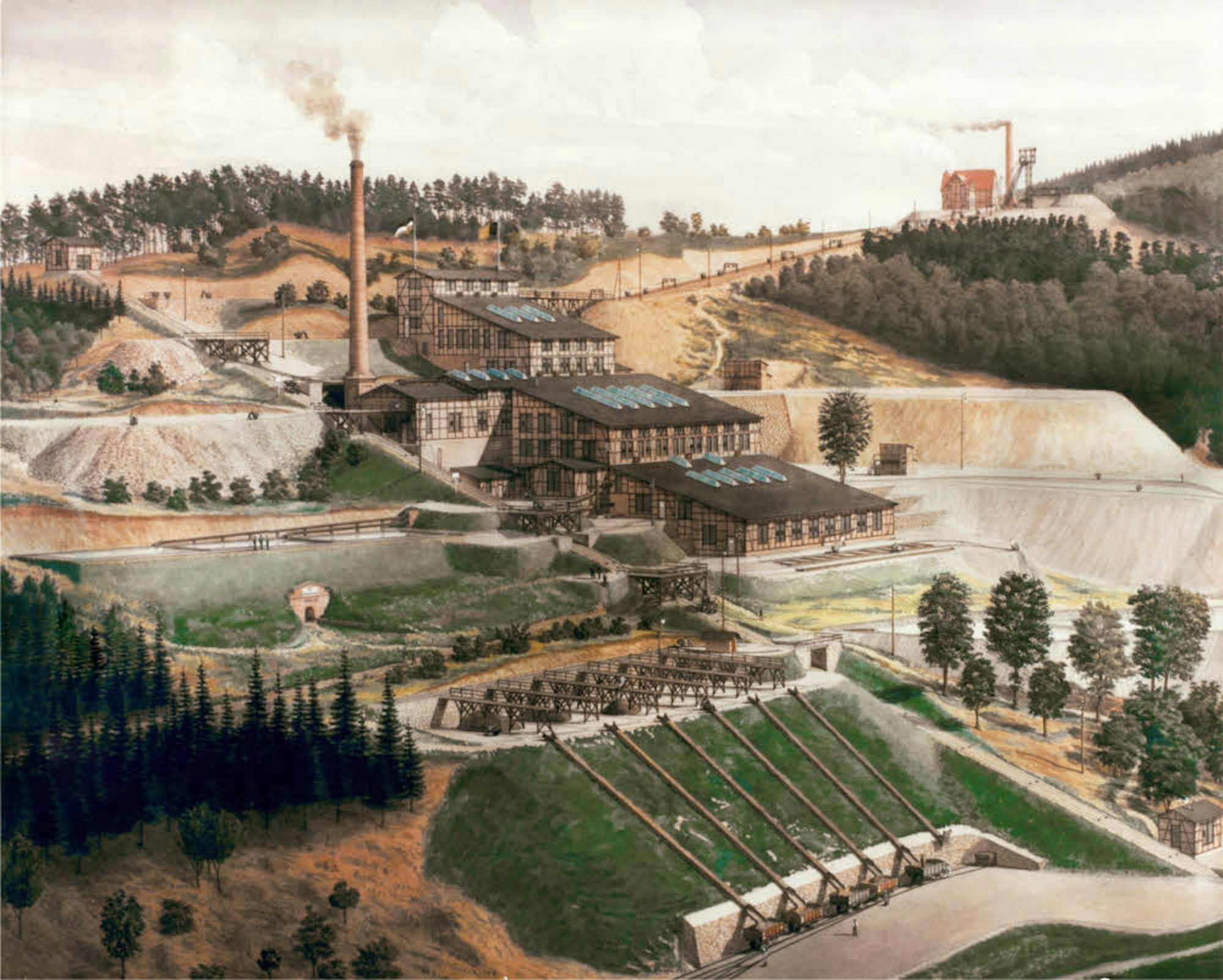 Am Fuß der früheren Grube Lüderich mit Hauptschacht (o. r.) und Erzaufbereitungsanlage (M.) fließt die Sülz vorbei.