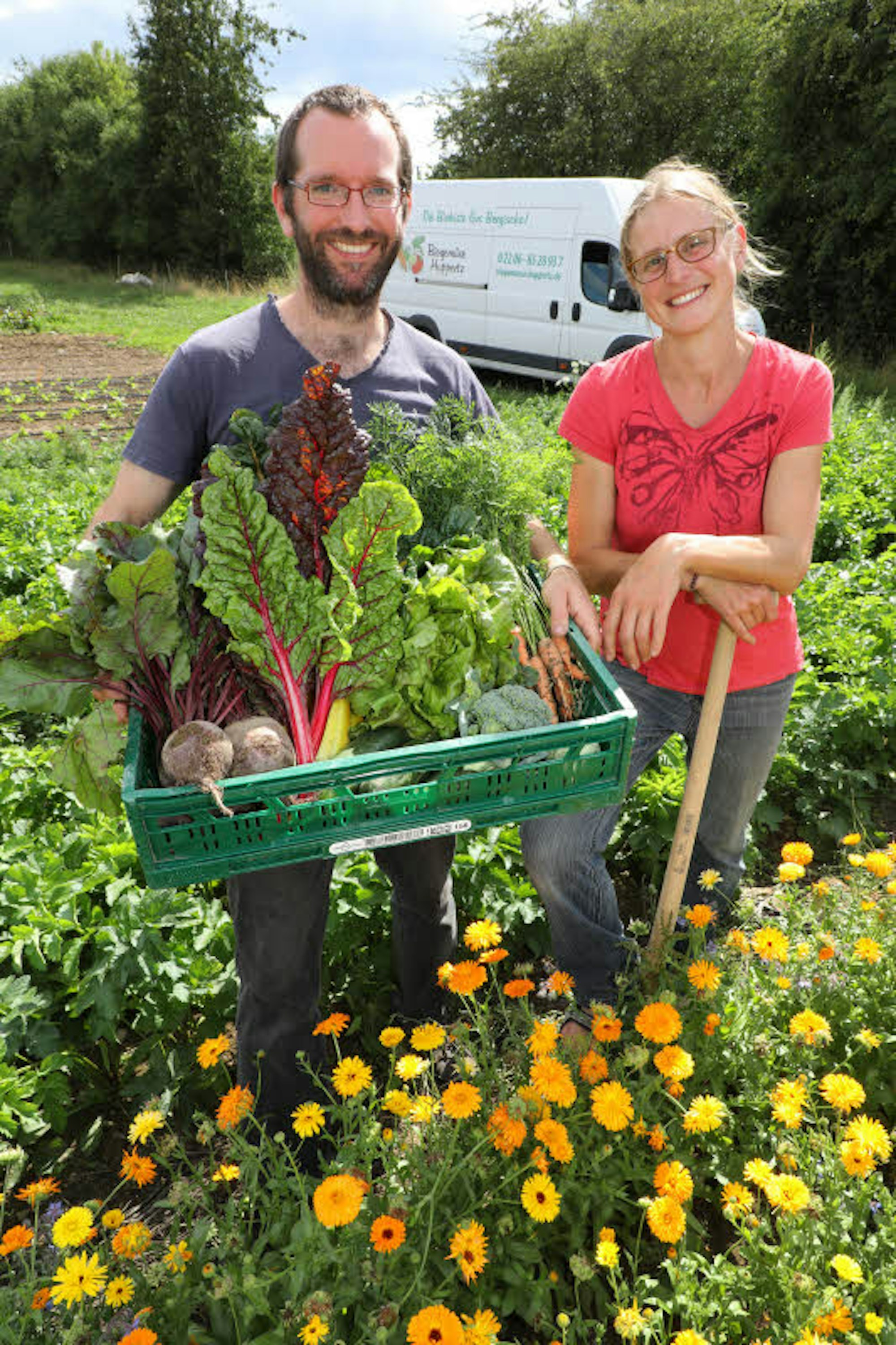 Gemüse und Salat im Abo: Verena und Adrian Huppertz bauen auf Overaths Höhen Gemüse an und liefern es kreisweit an Kunden aus.