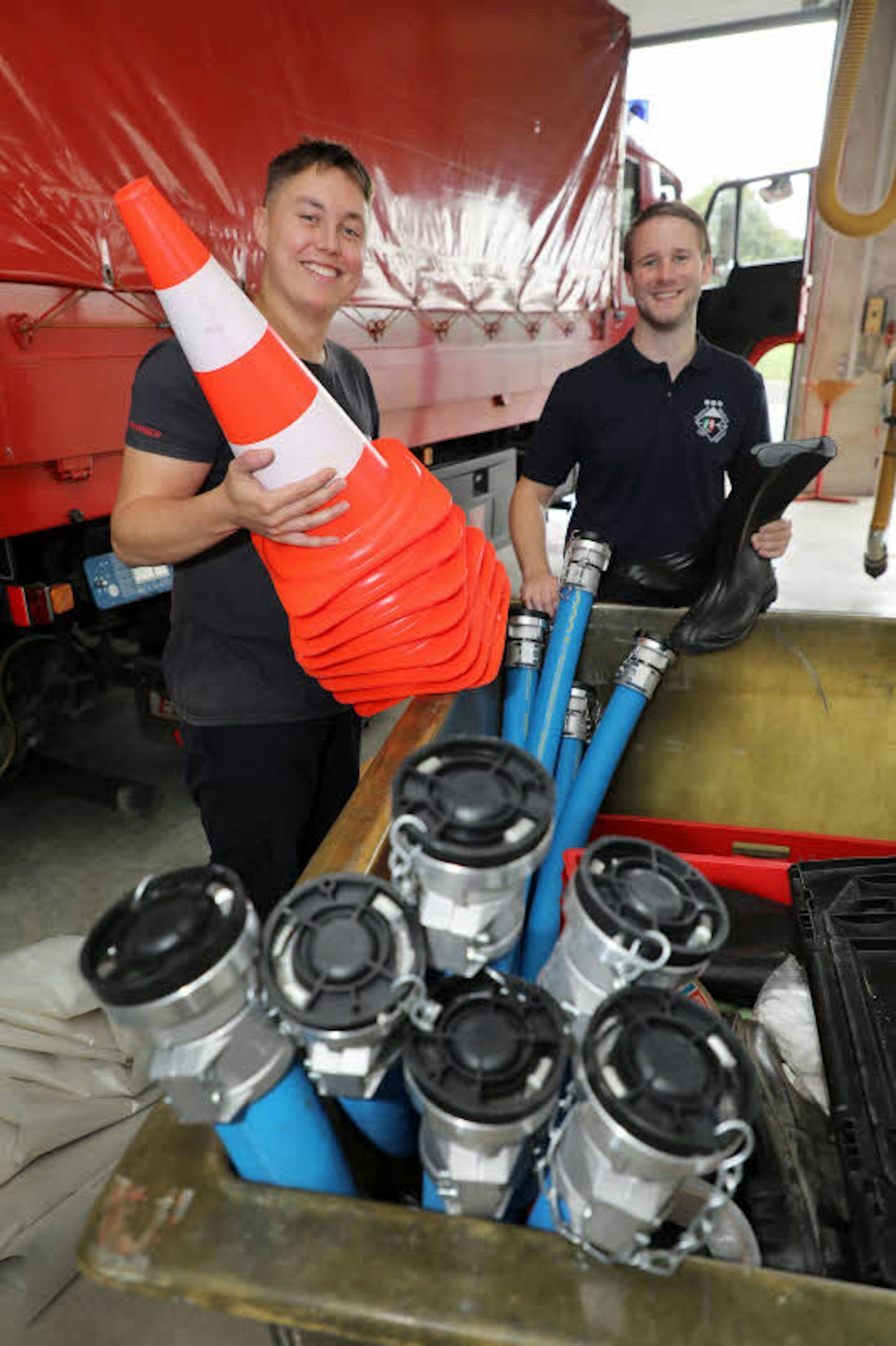 Kevin Kruiniger und Nikolas Heitkamp (r.) prüfen Feuerwehrgerät.