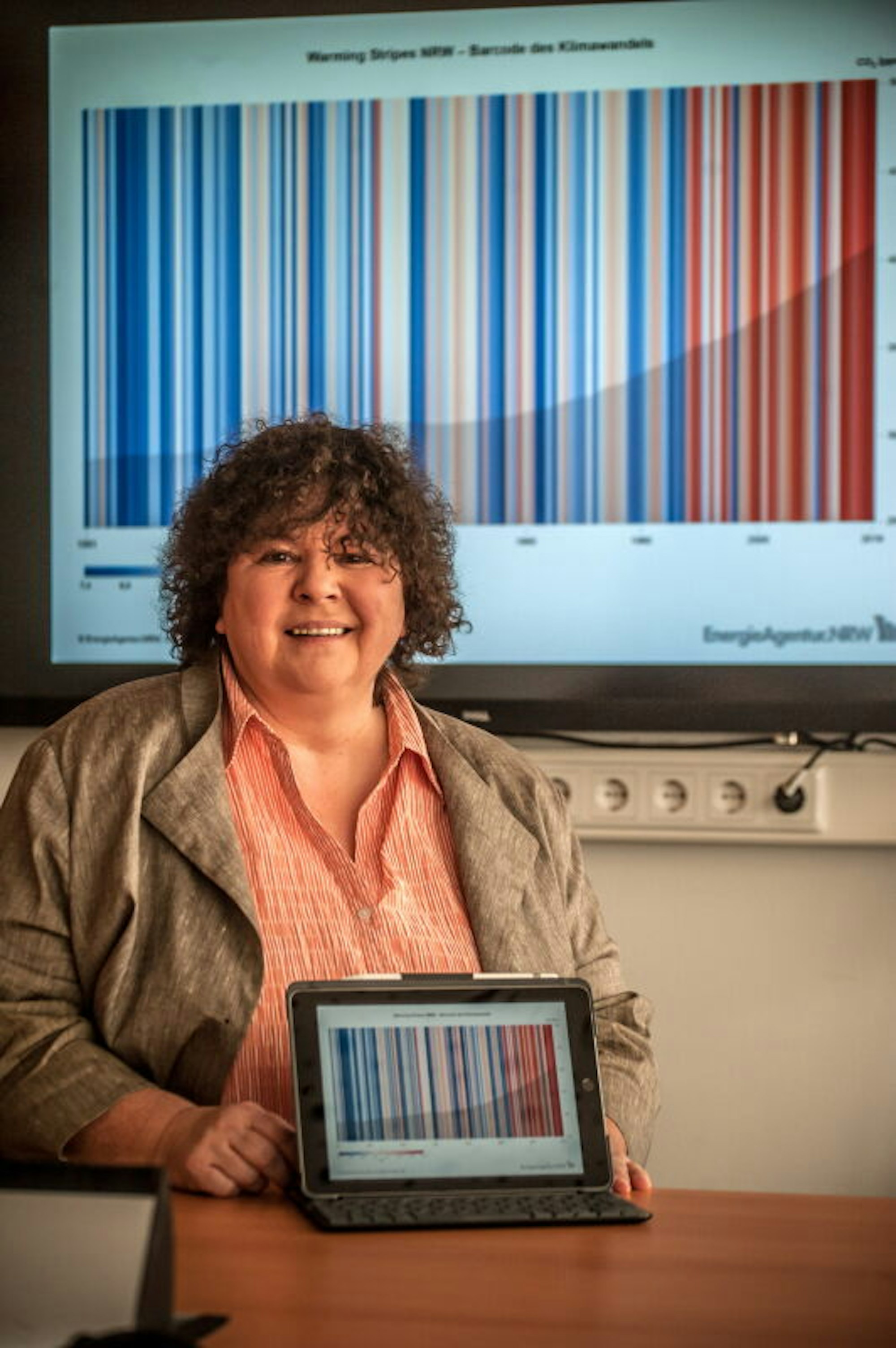 Die Erderwärmung in Farben: Die Leichlinger Klimaschutzmanagerin Monika Meves zeigt den Trend der jährlichen Durchschnitts-Temperaturen in Deutschland – es wird immer roter.