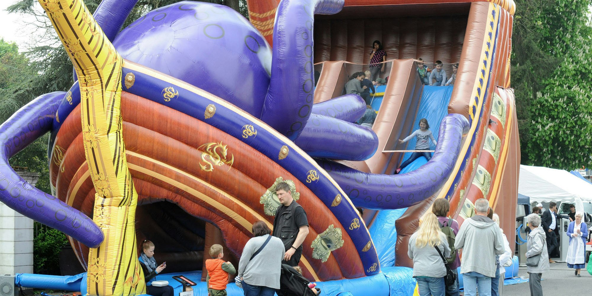 Das Piratenschiff, das Kindern mit seiner Luftrutsche schon beim Umweltfest Spaß gemacht hat, pustet der Verein Burscheid live bei der Schützen-Kirmes am 2. September auf.