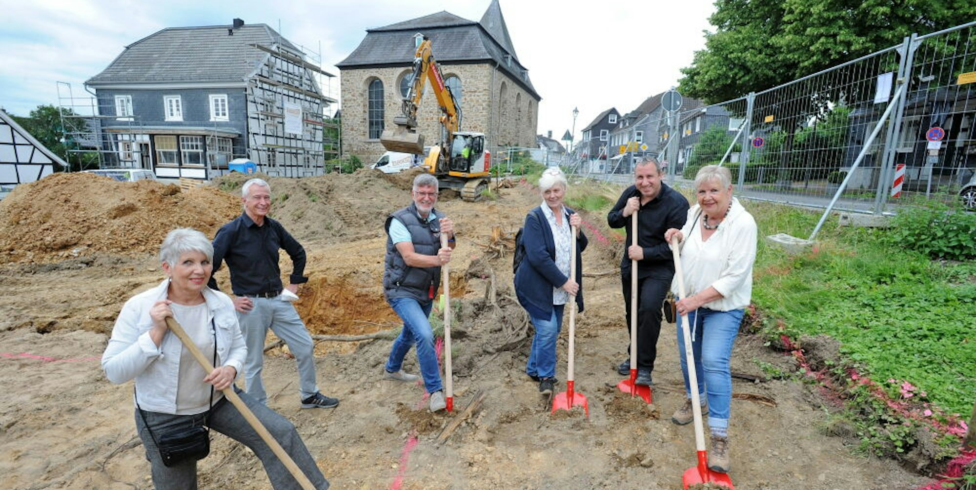 Leichlingen-Witzhelden – Weit zurückblicken musste Gerd Busch, der Kirchbaumeister des Presbyteriums, als er zur roten Schaufel griff. 25 Jahre weit. So lange sei es her, dass die evangelische Gemeinde in Witzhelden von einem neuen Gemeindehaus spreche, sagte er am Donnerstag beim ersten Spatenstich für das Projekt. Jetzt ist es so weit. Wo einst der Spielplatz war, türmen sich zwischen Absperrgittern frisch ausgehobene Erdhügel, hat der Bagger unterhalb der Hauptstraße das erste Loch in den Boden gegraben.