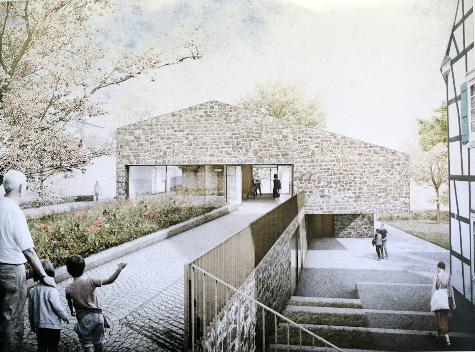 Viel Mühe mit der Hanglage des zweigeschossigen Gebäudes und mit den Baumaterialien haben sich Architekt Konstantin Pichler und die Landschaftsarchitekten vom Büro Stern an diesem exponierten Schauplatz im Dorfkern gemacht. Das Kölner Büro Kastner Pichler hat 2018 den vom Presbyterium ausgelobten Architektenwettbewerb gewonnen. Die Fassade aus Grauwacke, Natursteinböden, das asymmetrisch abfallende Schieferdach, draußen Sitzmauern aus Bruchsteinen und ein begrünter Vorplatz mit historischem Brunnenschacht nehmen auf den Ansichten Rücksicht auf die bergische Barockkirche und die Fachwerk-Umgebung des Denkmal-Dorfkerns.