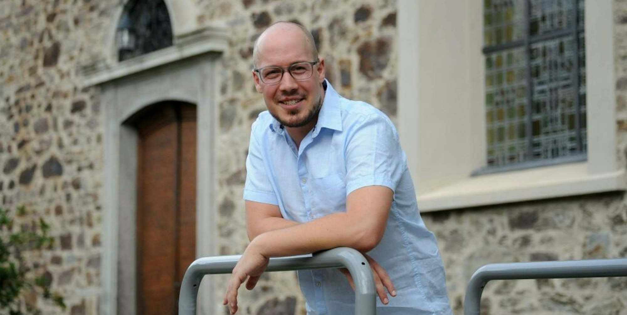 Kantor Carsten Ehret vor seinem Abschlusskonzert des Leichlinger Orgelsommers in der evangelischen Kirche an der Marktstraße.