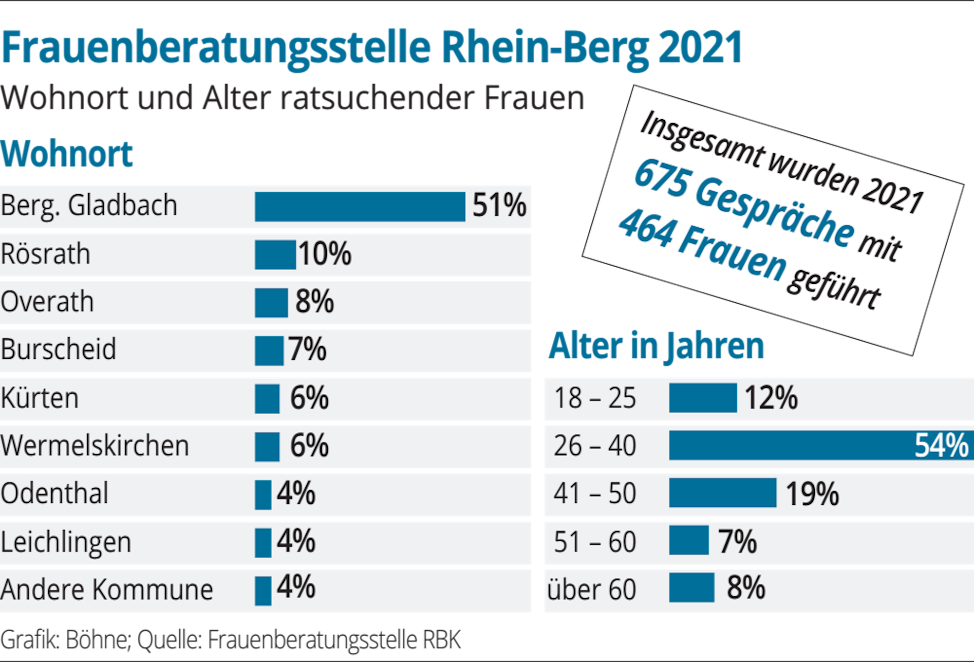 Verdoppelt haben sich die Beratungsgespräche mit Ratsuchenden aus dem Nordkreis mit den Kommunen Burscheid, Leichlingen und Wermelskirchen. Fast 90 Frauen haben die Beratungsstelle kontaktiert, 45 Frauen waren es im Jahr 2020. „Wir führen dies auf unsere verstärkten Vernetzungsaktivitäten im Nordkreis zurück“, erklärt die Leiterin. Die Anfragen aus Bergisch Gladbach und den Städten im Südkreis hätten sich geringfügig verringert.