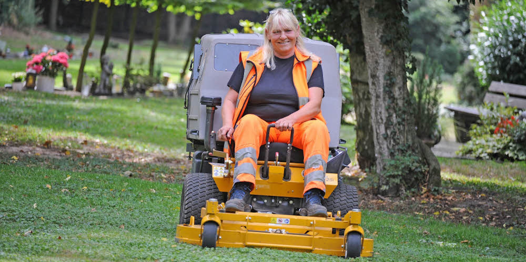 Alle zwei Wochen wird der Rasen gemäht: Friedhofsgärtnerin Ingrid Weiß beim Einsatz auf dem Waldfriedhof.