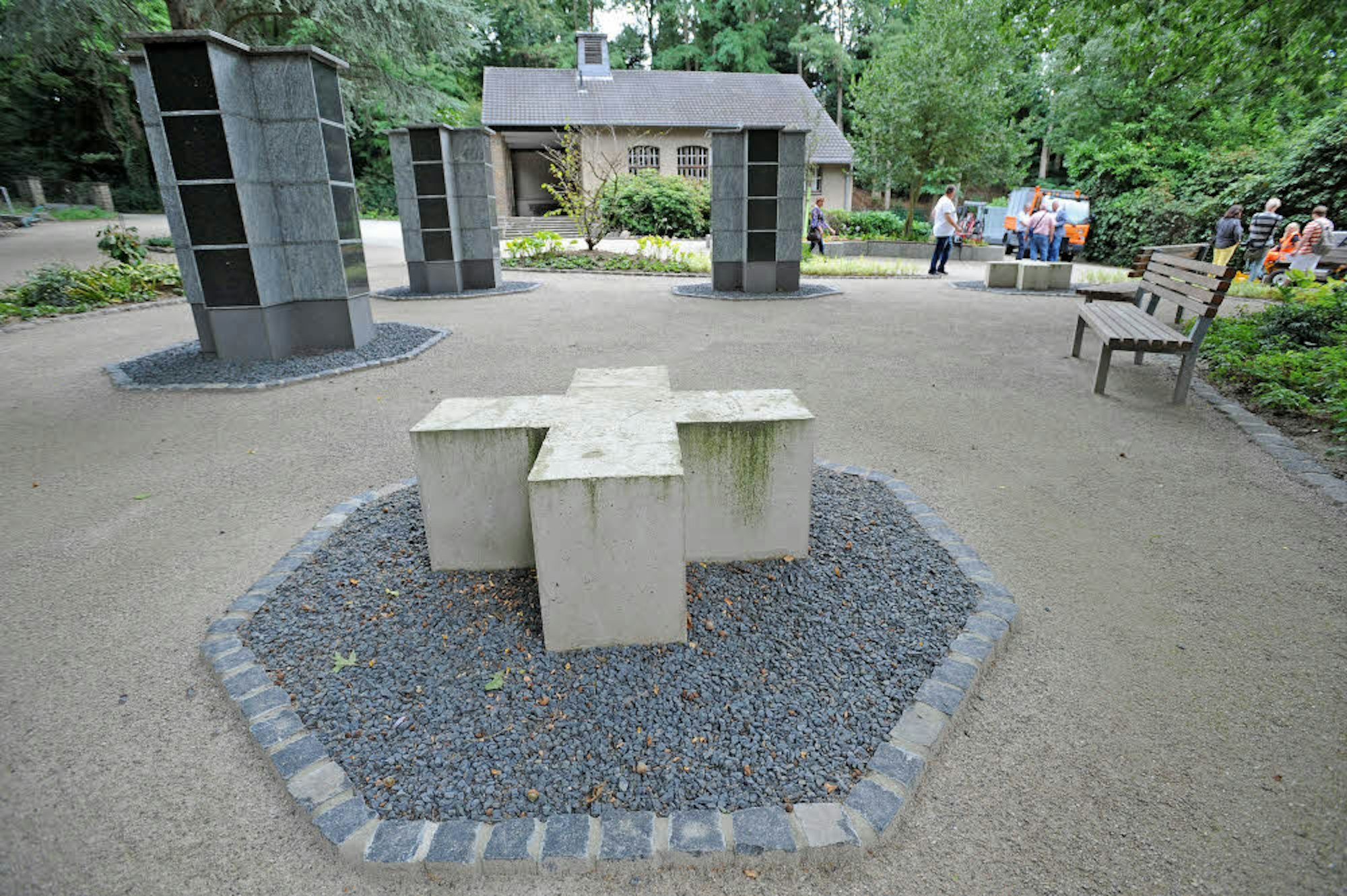 Die mit Dolomitsand befestigte und rundum bepflanzte Gedenkstätte der Kolumbarien. Auf zwei Fundamente kommen weitere Stelen.