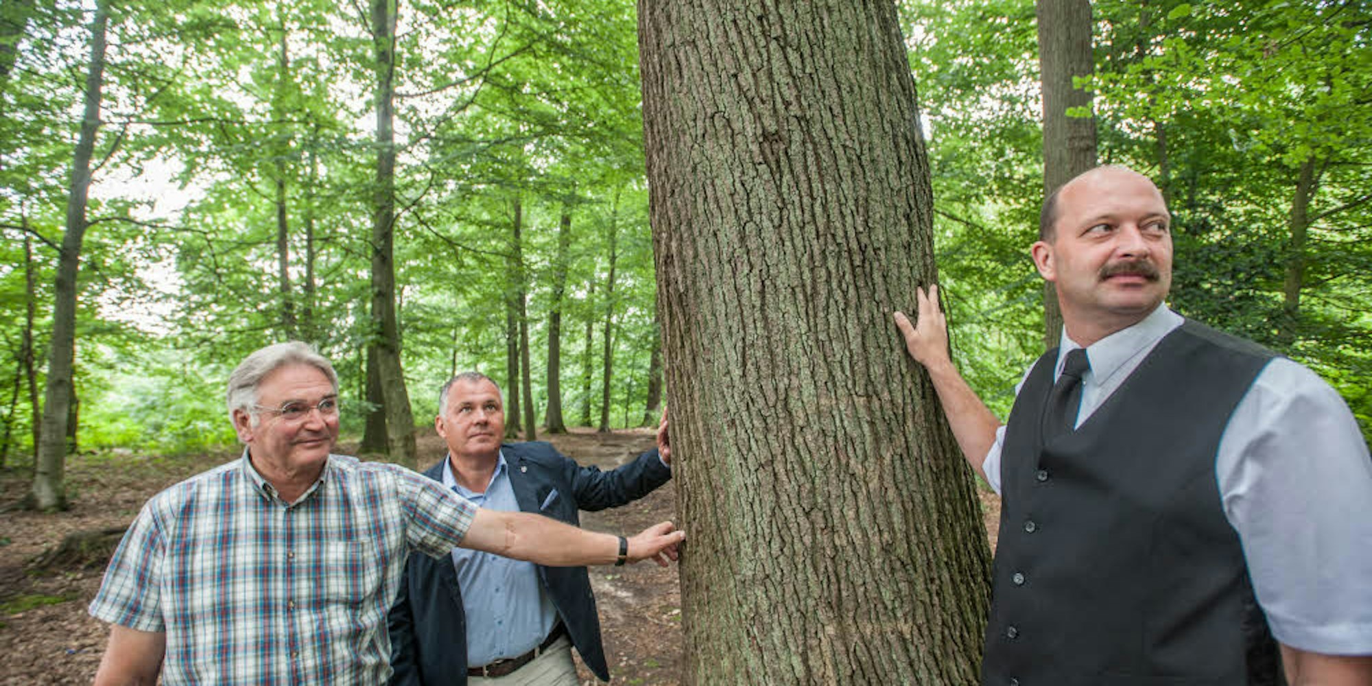 Bestatter Ralf Aschenbroich (von rechts) mit Bürgermeister Frank Steffes und Landwirt Karl-Otto Dickhoven als Beauftragtem des Eigentümers Graf Mirbach von Harff an einem der Bäume des künftigen Friedwaldes im Vorster Busch.