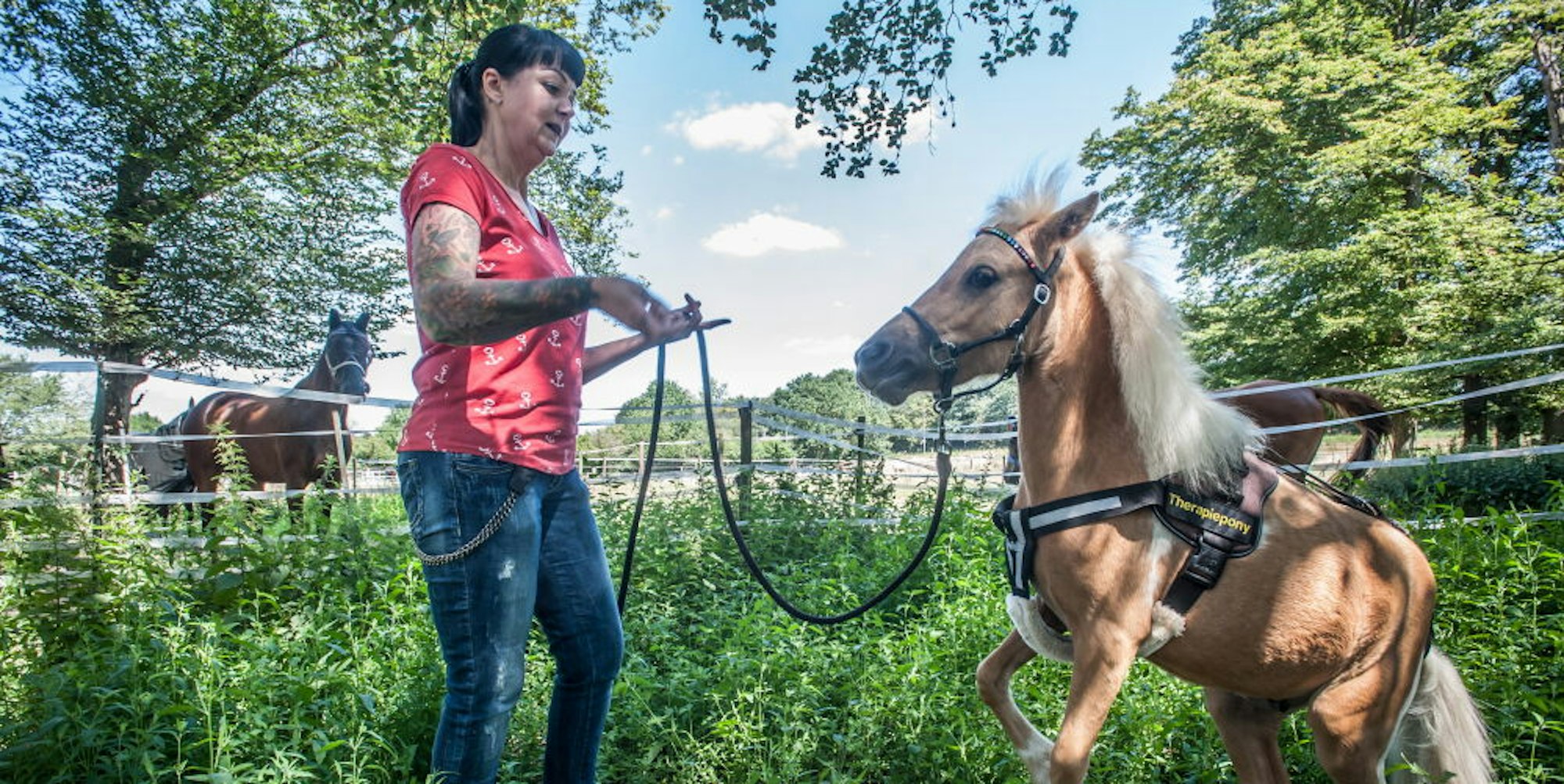 Was konnte sie nun mit dem kleinen Kerl anfangen, fragte Schmitz sich – und Google. Und fand heraus, dass Miniponys in den USA schon erfolgreich in der Therapie eingesetzt werden. Heute trägt Müsli ein Geschirr, auf dem auf der einen Seite sein Namen steht und auf der anderen Seite „Therapiepony“.