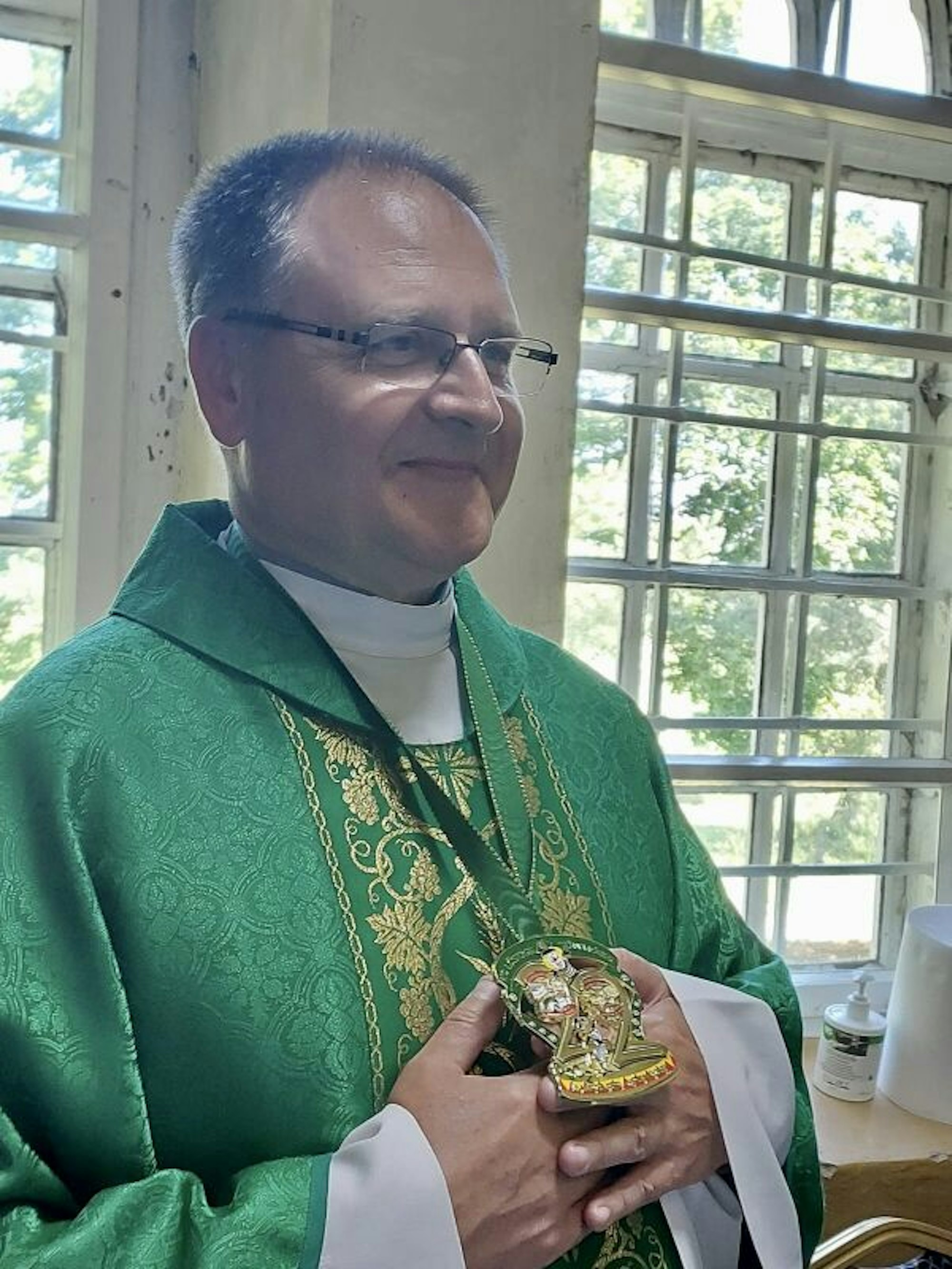 Nach der Festmesse übergab Dietmar Schur einen für den Bischof gedrechselten Engel und Ulrich Gürster im Auftrag der Karnevalsgesellschaft Löstige Stänedräjer auch deren Karnevalsorden. Auch Pfarrer Arvydas erhielt den Orden mit besten Grüßen vom Präsidenten der KG Löstige Stänedräjer, Dietmar Köster. Beide verbindet eine tiefe Freundschaft.