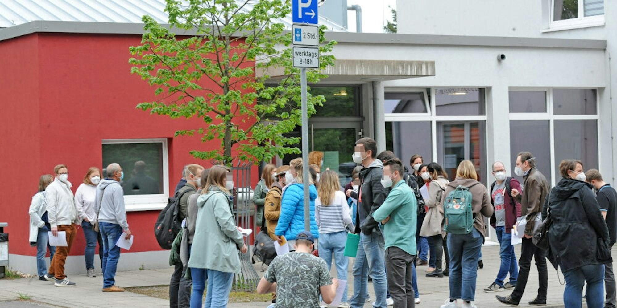 Warteschlange bei der mobilen Impfaktion vor dem Burscheider Megafon.