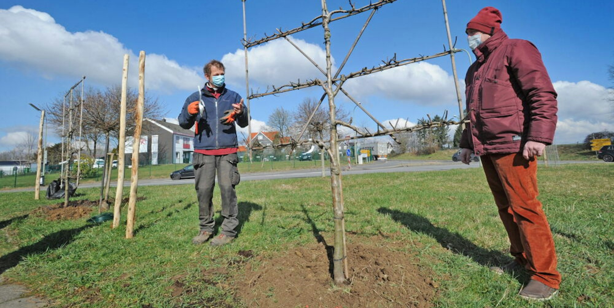 Hilgen – Läuft alles gut, dann könnten im Sommer 2022 schon die ersten Äpfel und Birnen auf der Wiese Ecke Hilgener Straße und Witzheldener Straße geerntet werden. Am Freitag pflanzte der Nümbrechter Baumpfleger Harald Hamel entlang des Fußwegs eine Hecke aus Spalierobst. Zwei Birnbäume und vier Apfelbäume hat der Verein „Burscheid Live“ jetzt möglich gemacht.