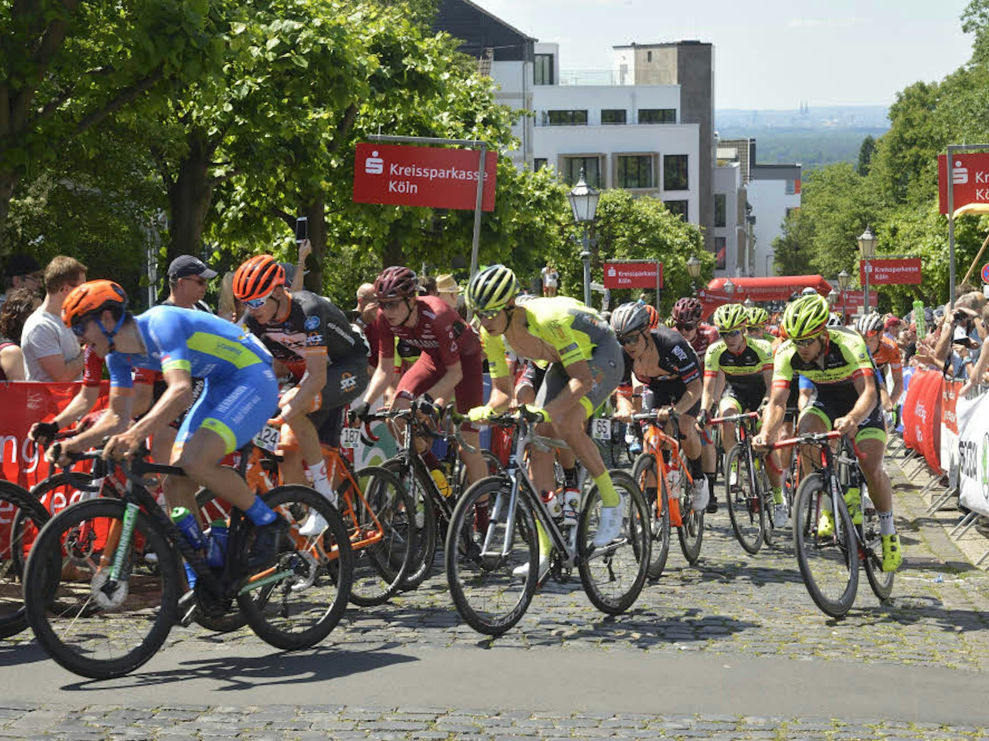 Profis und Amateure kämpften beim Radklassiker „Rund um Köln“ um Punkte und gute Zeiten. Als besondere Marterstrecke gilt das Kopfsteinpflaster am Schloss Bensberg.