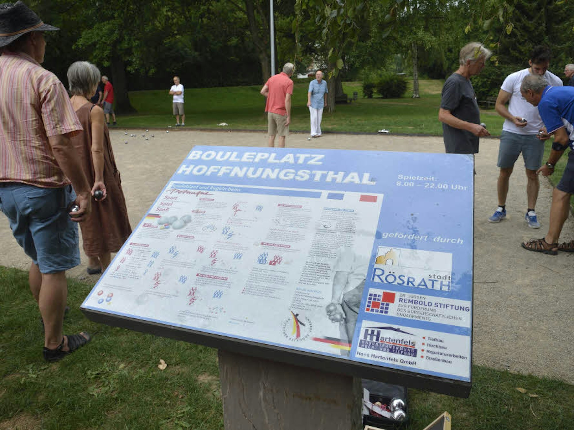 Wer einmal Boule ausprobieren will – am Platz in Hoffnungsthal gibt die Tafel auch Auskunft über die Regeln.